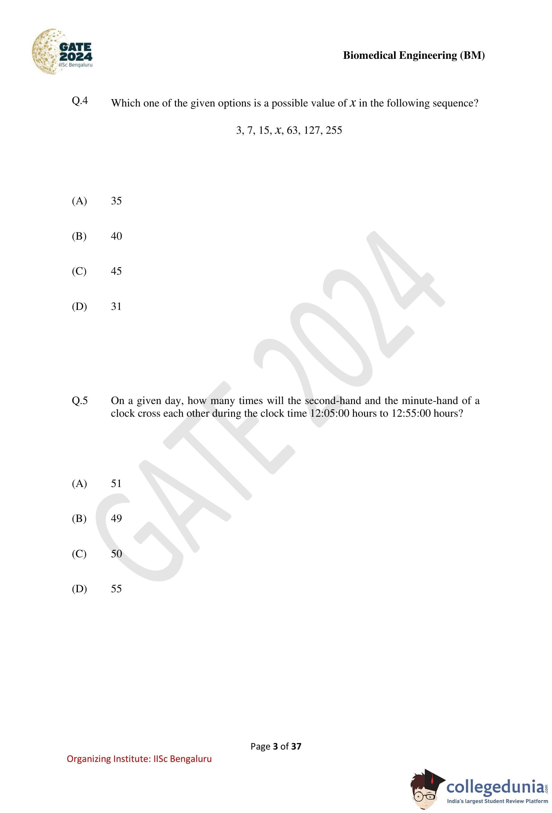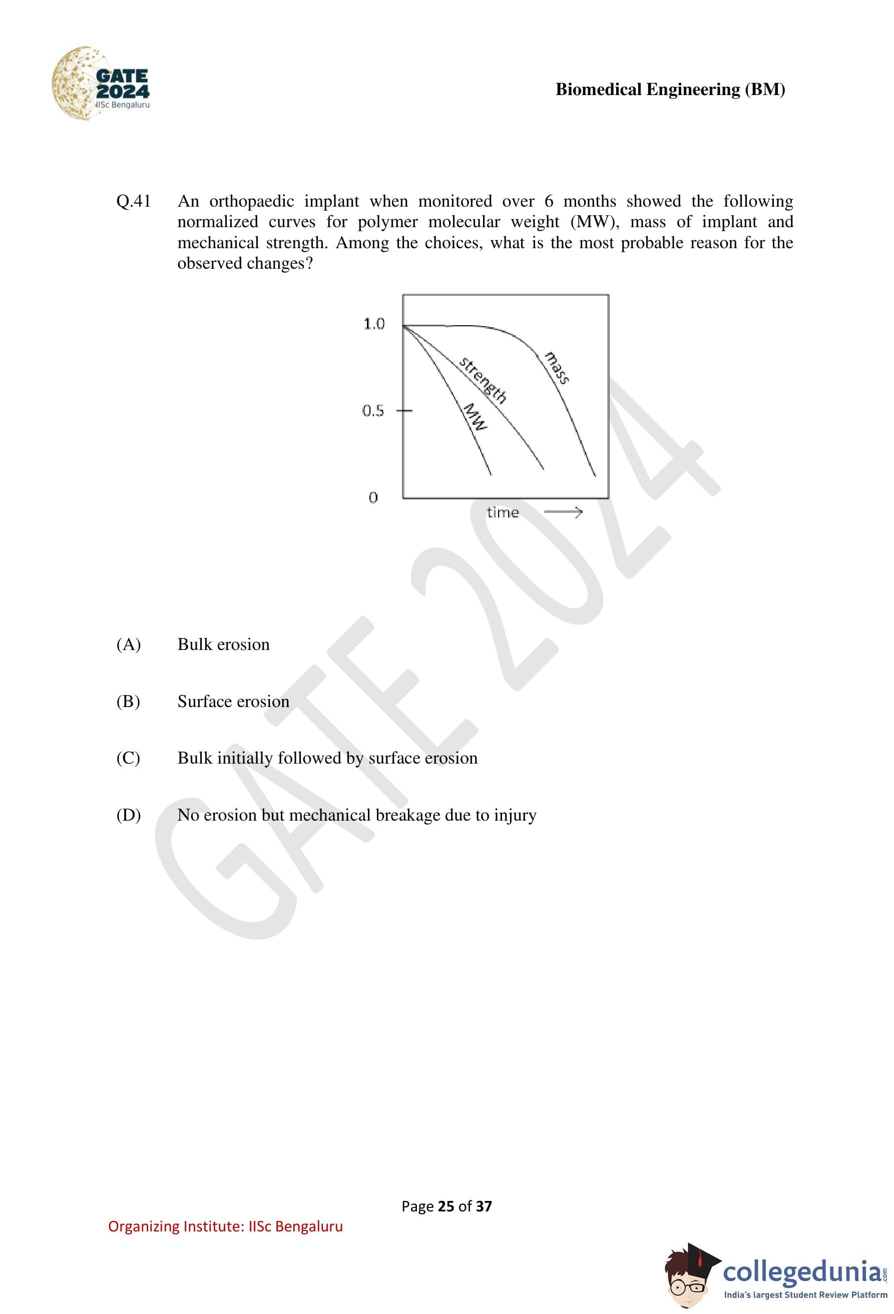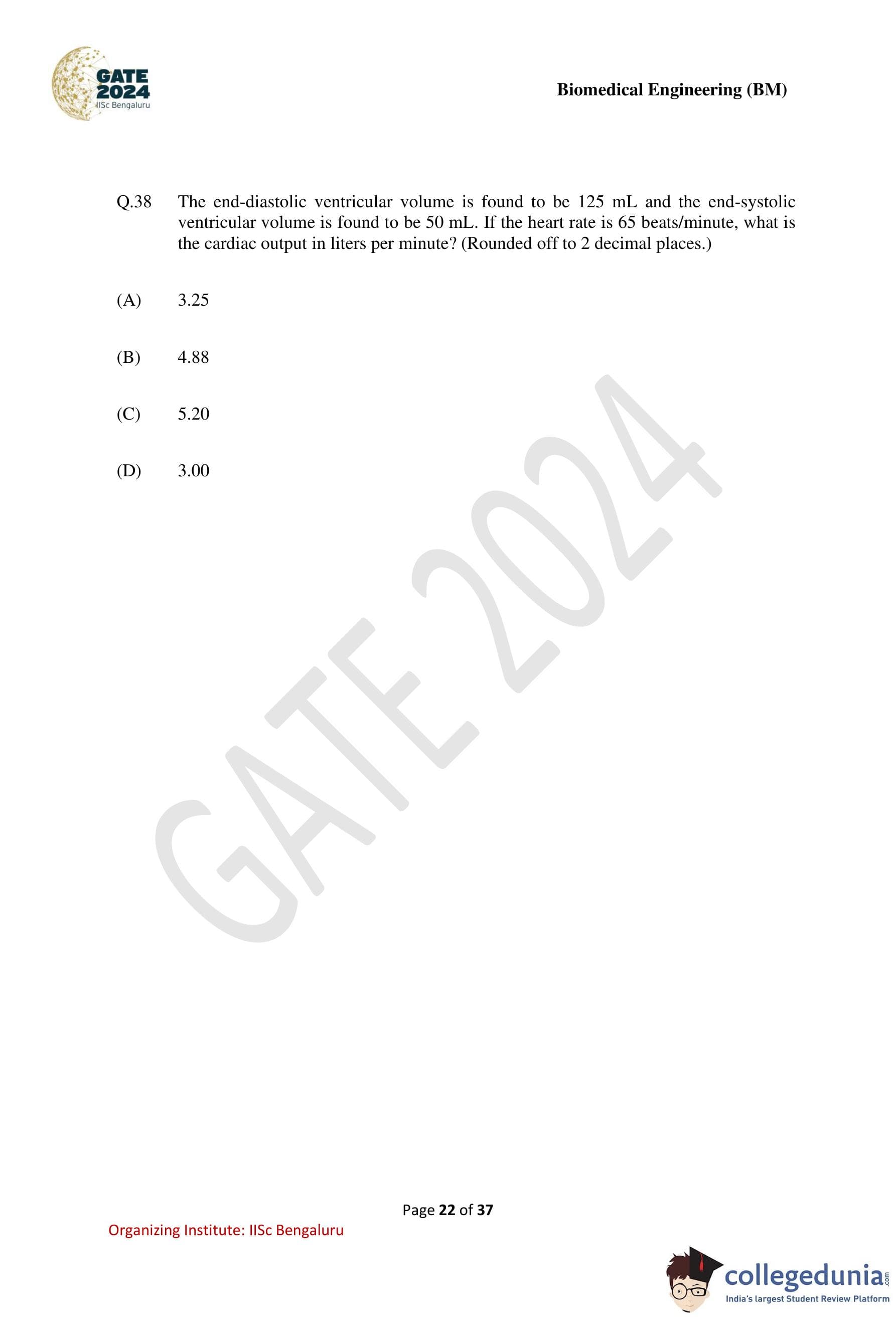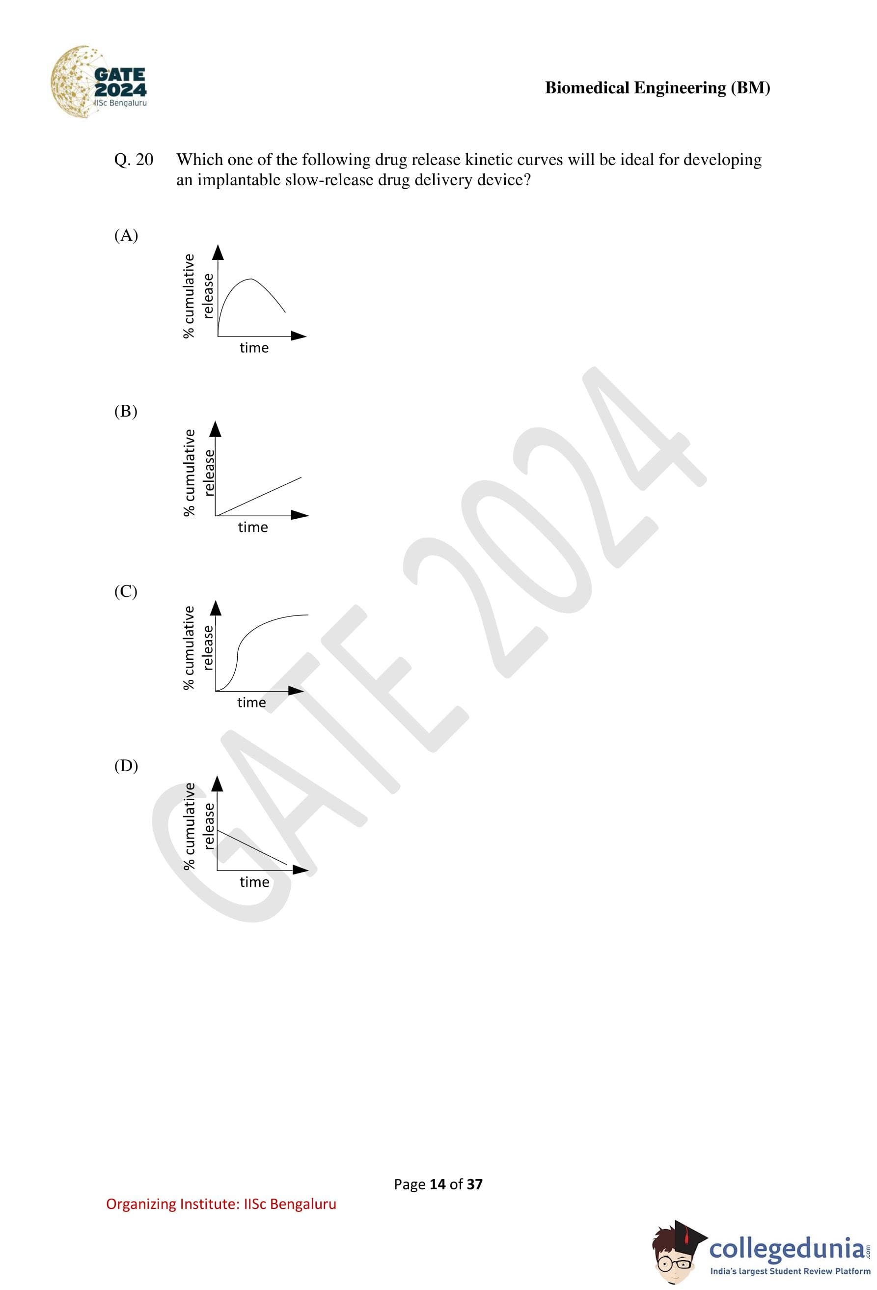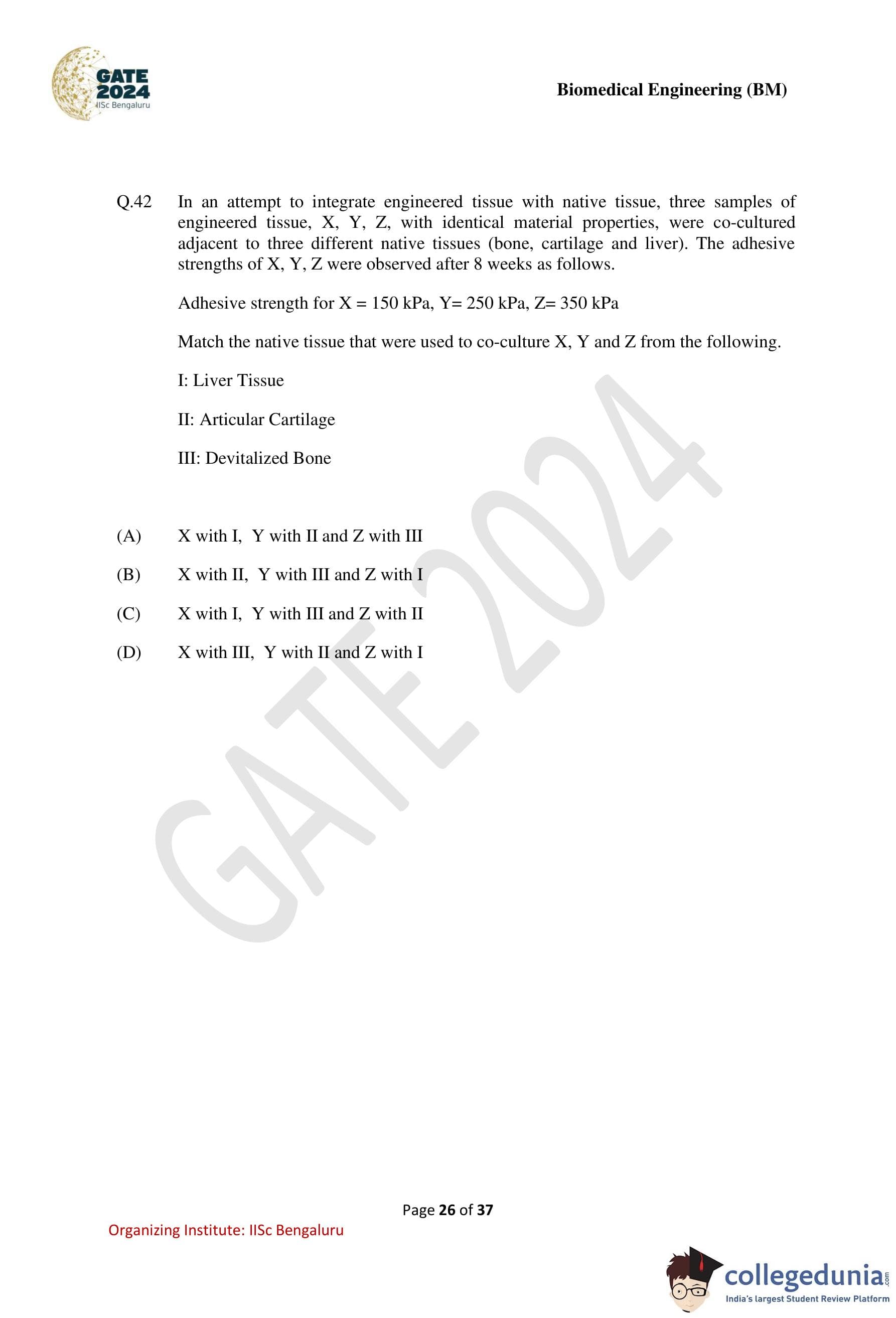 GATE 2024 Biomedical Engineering Question Paper PDF is available here. IISc Banglore conducted GATE 2024 Biomedical Engineering exam on February 4 in the Forenoon Session from 9:30 AM to 12:30 PM. Students have to answer 65 questions in GATE 2024 Biomedical Engineering Question Paper carrying a total weightage of 100 marks. 10 questions are from the General Aptitude section and 55 questions are from Engineering Mathematics and Core Discipline.