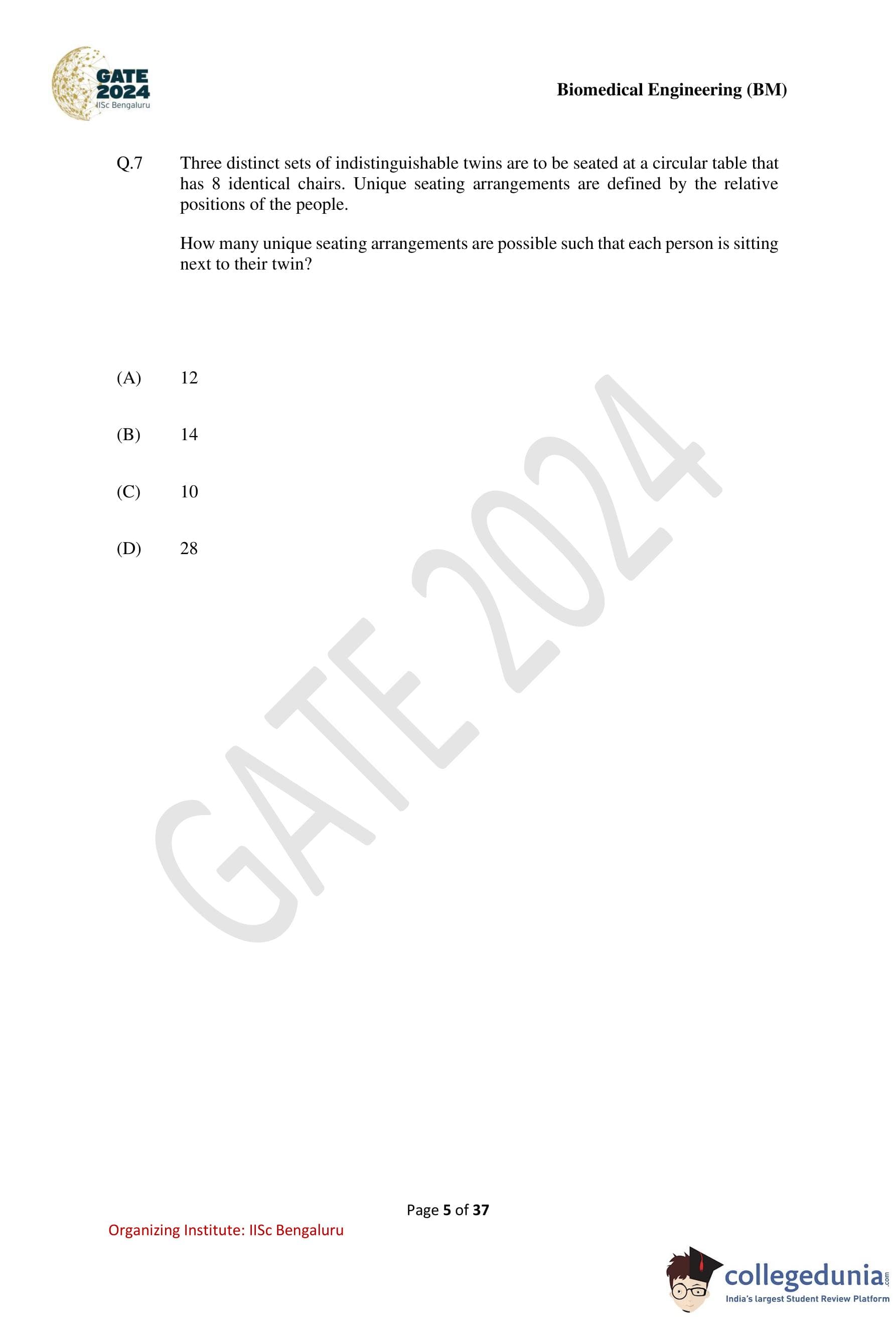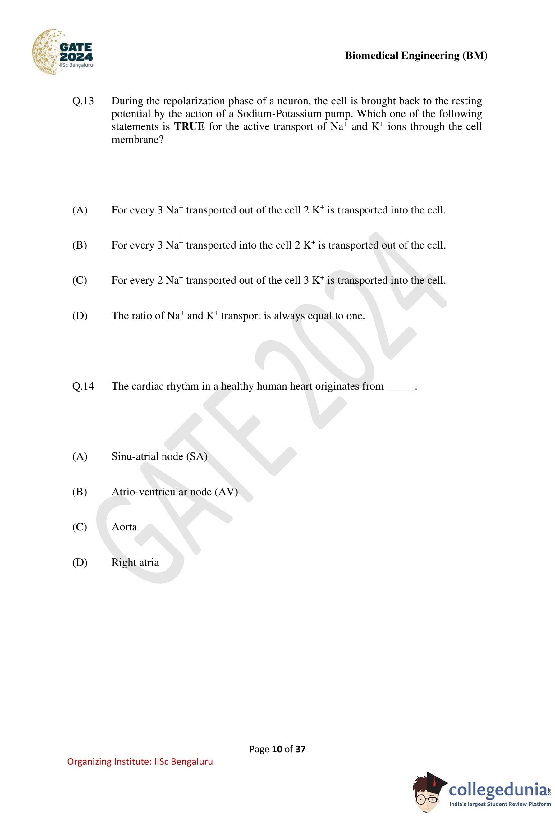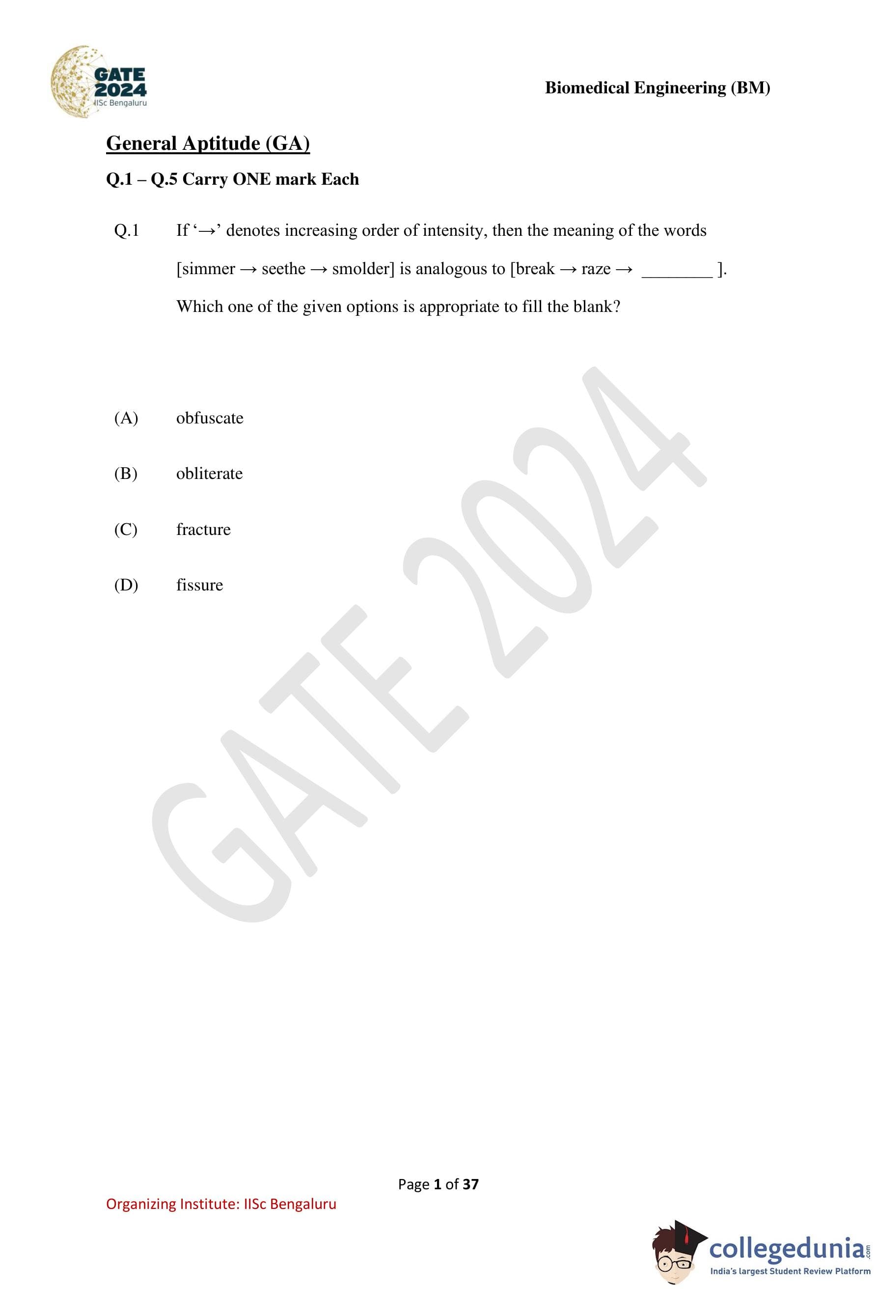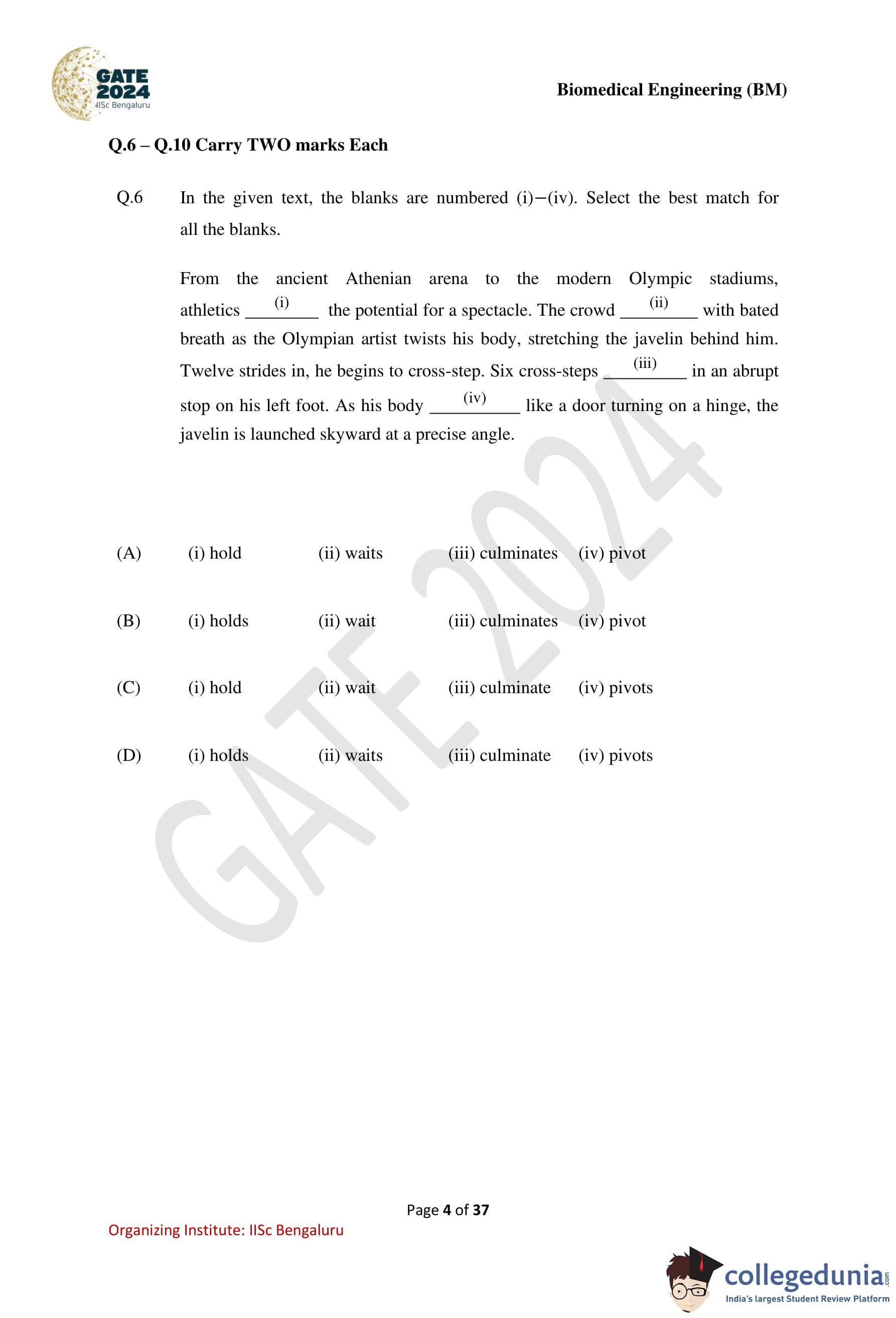 GATE 2024 Biomedical Engineering Question Paper PDF is available here. IISc Banglore conducted GATE 2024 Biomedical Engineering exam on February 4 in the Forenoon Session from 9:30 AM to 12:30 PM. Students have to answer 65 questions in GATE 2024 Biomedical Engineering Question Paper carrying a total weightage of 100 marks. 10 questions are from the General Aptitude section and 55 questions are from Engineering Mathematics and Core Discipline.
