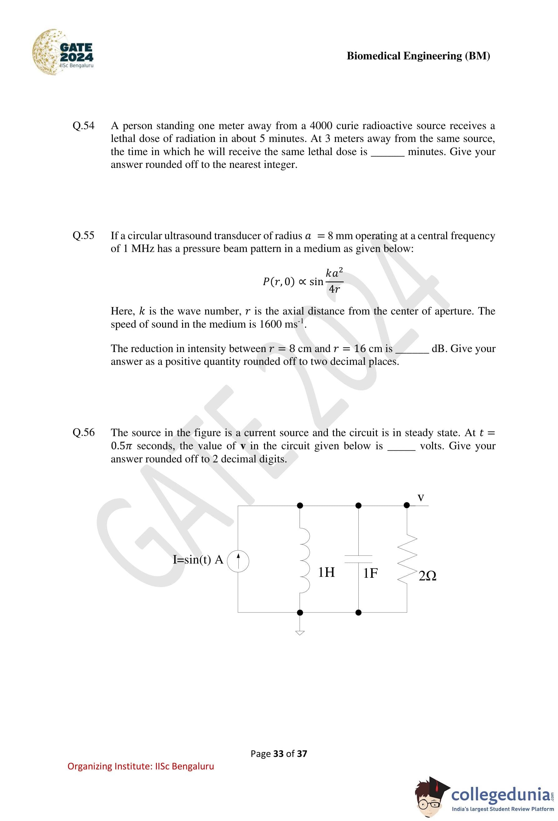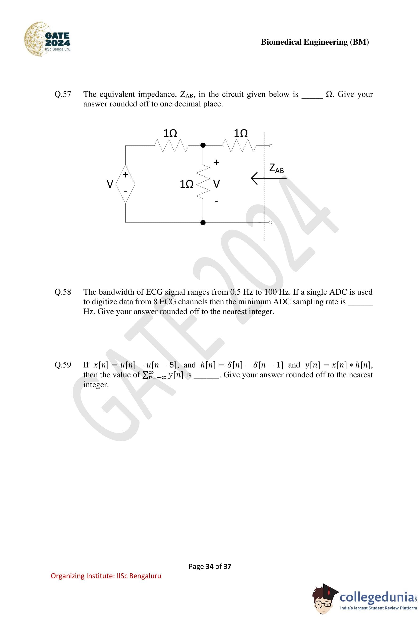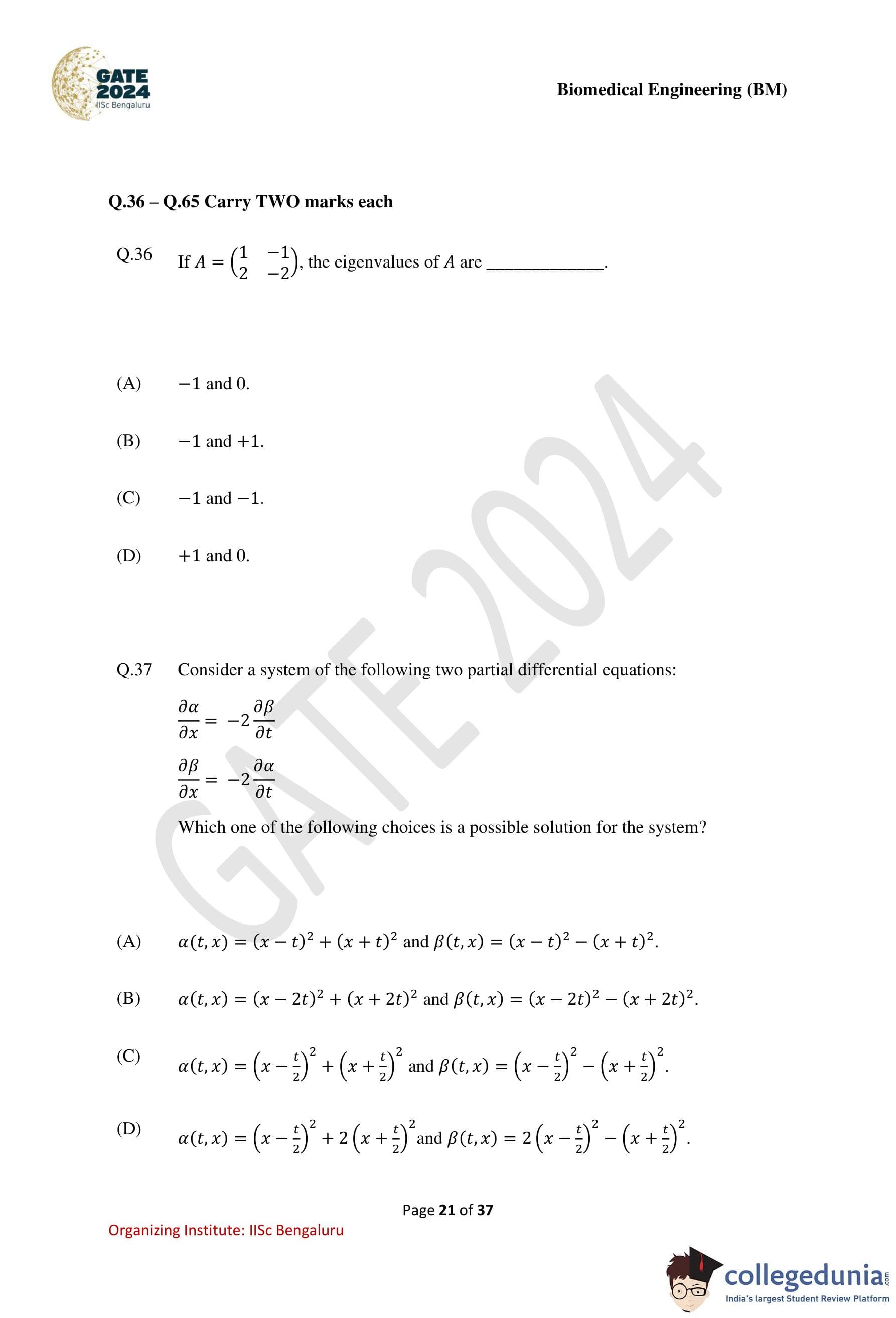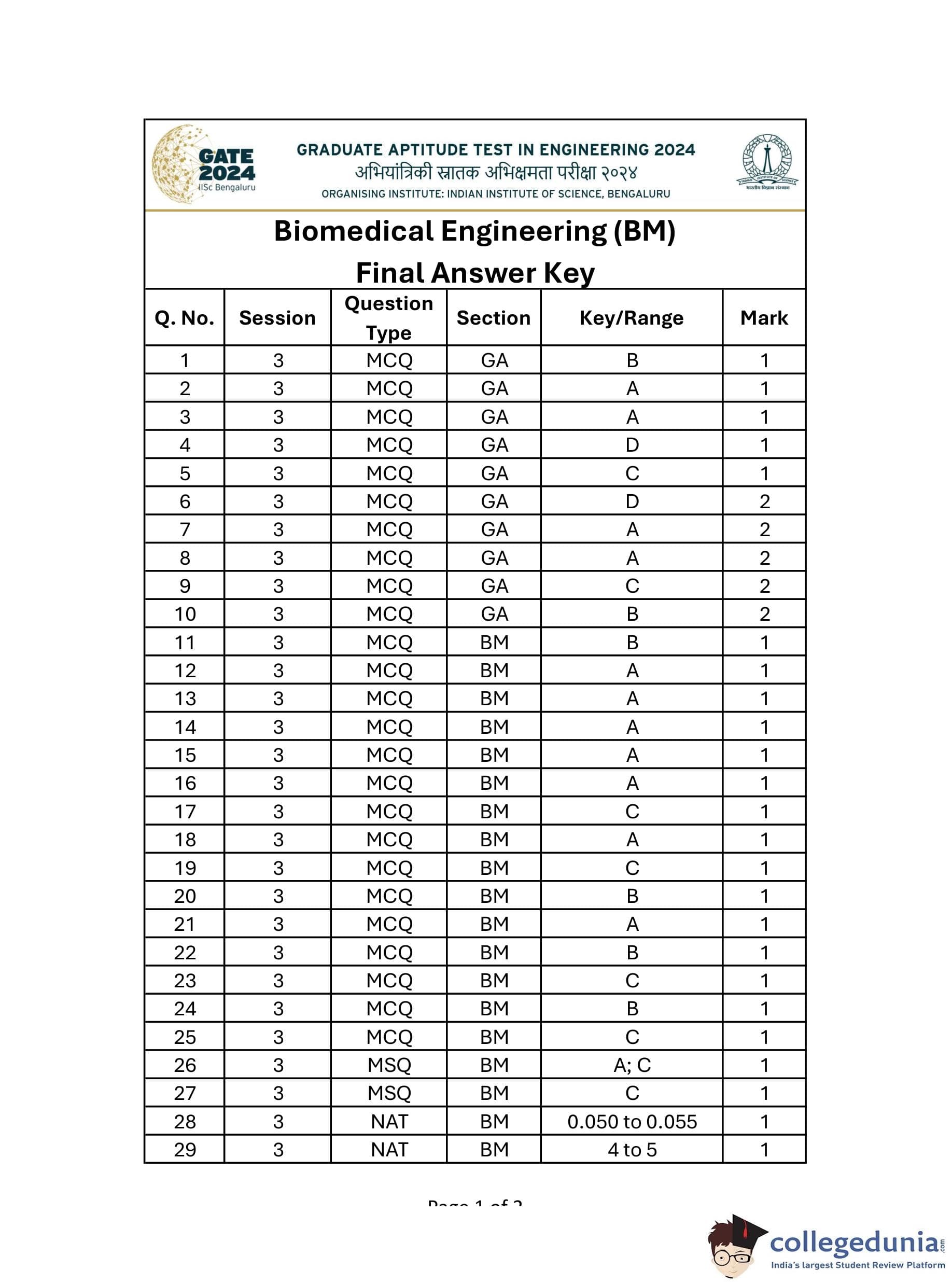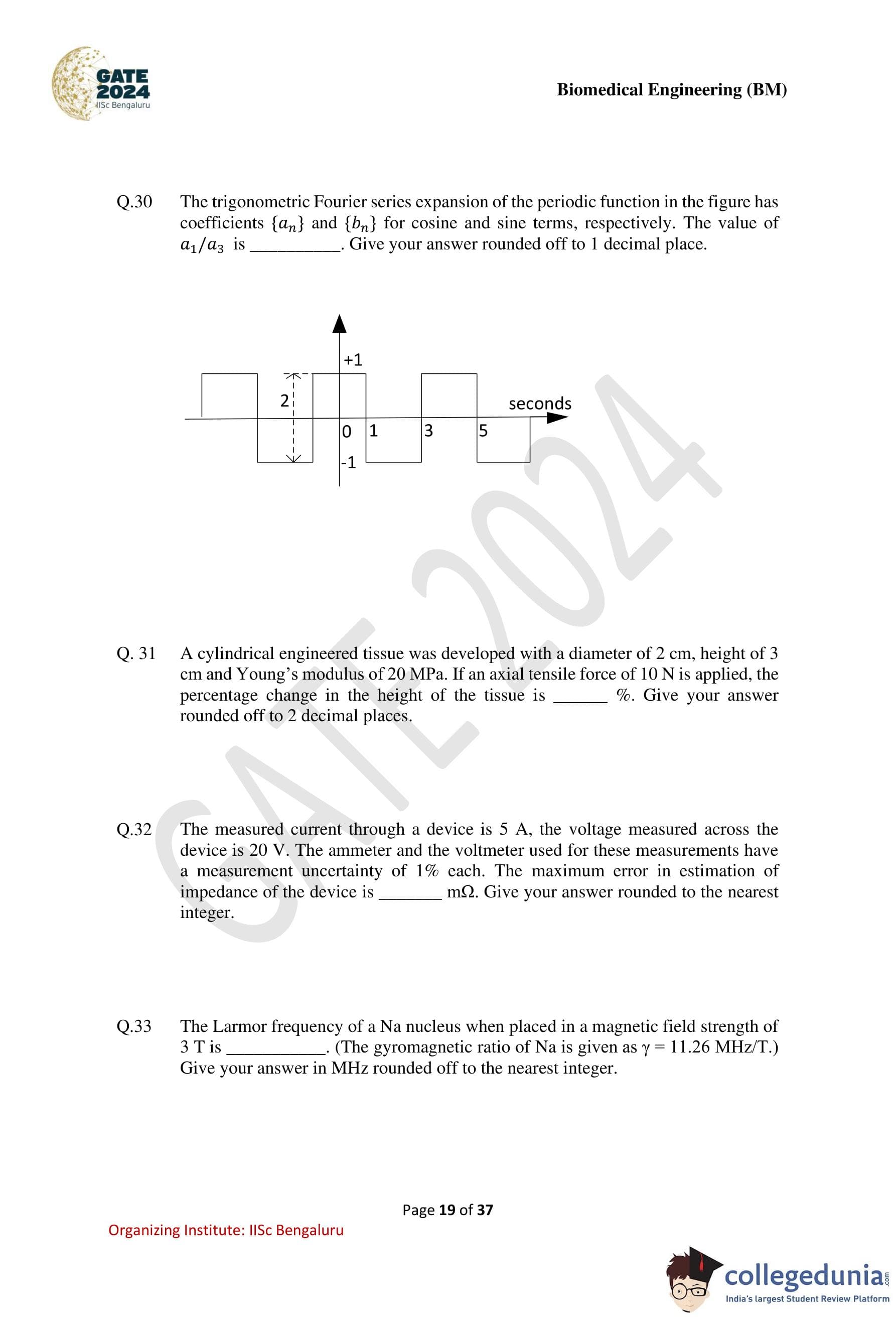 GATE 2024 Biomedical Engineering Question Paper PDF is available here. IISc Banglore conducted GATE 2024 Biomedical Engineering exam on February 4 in the Forenoon Session from 9:30 AM to 12:30 PM. Students have to answer 65 questions in GATE 2024 Biomedical Engineering Question Paper carrying a total weightage of 100 marks. 10 questions are from the General Aptitude section and 55 questions are from Engineering Mathematics and Core Discipline.