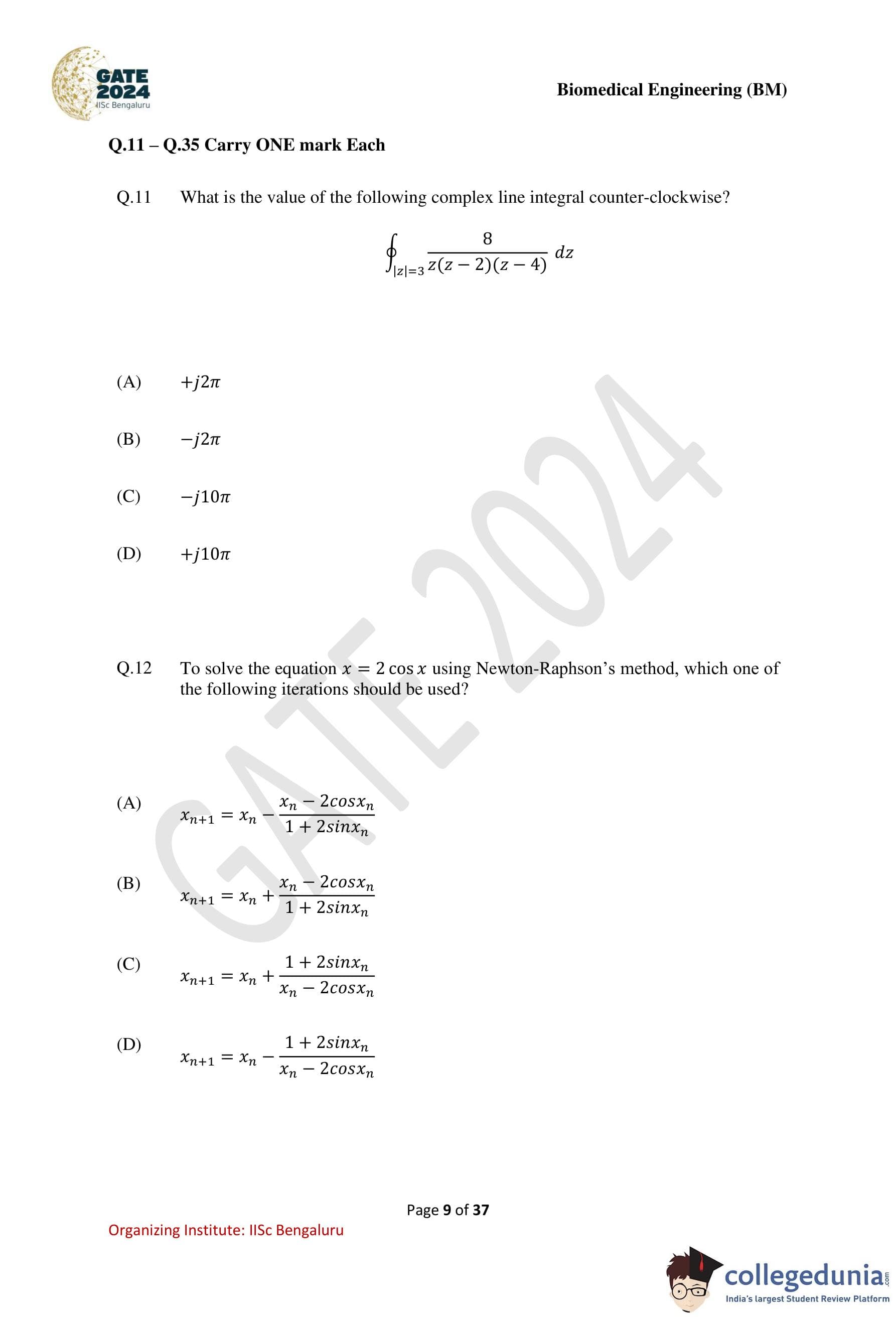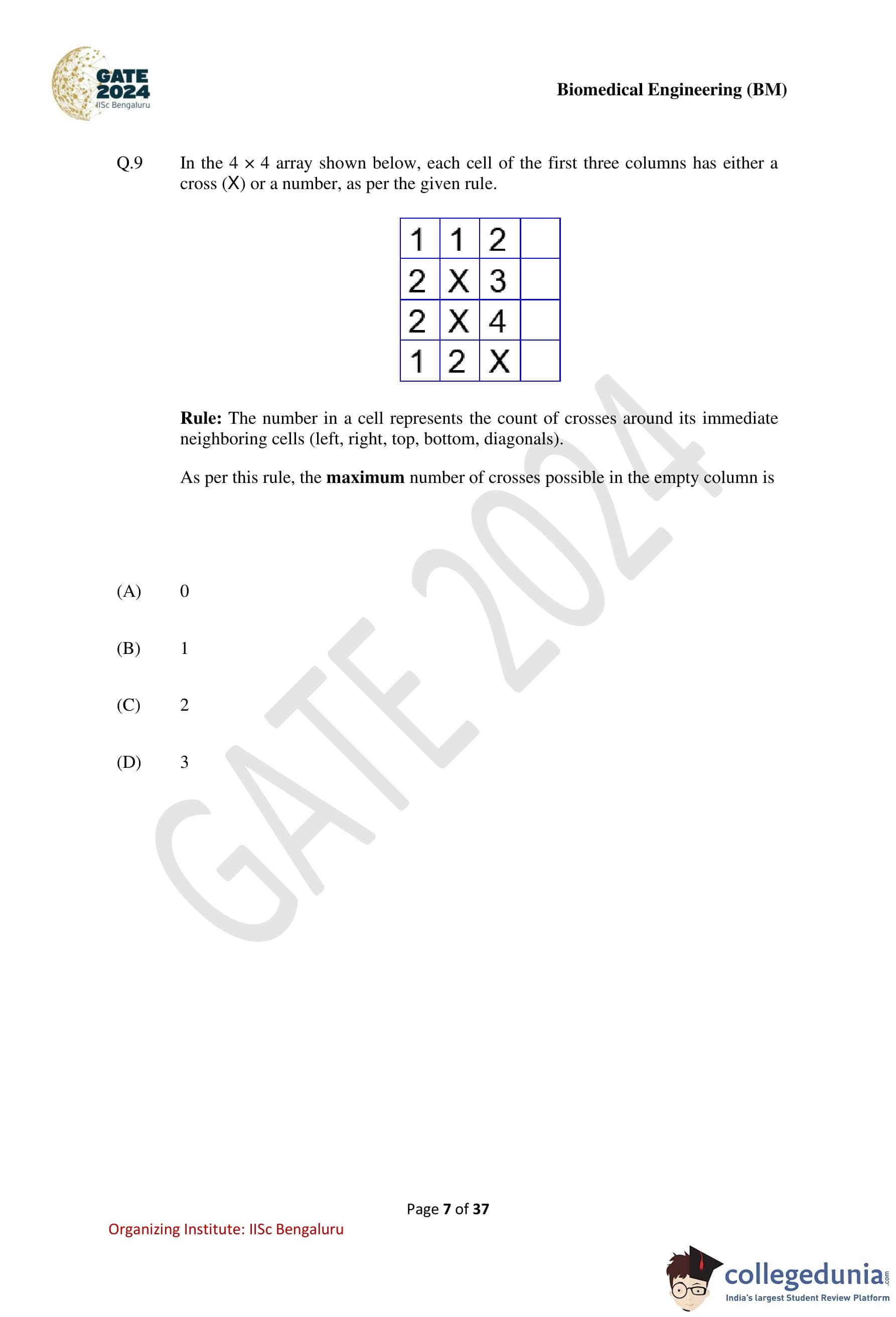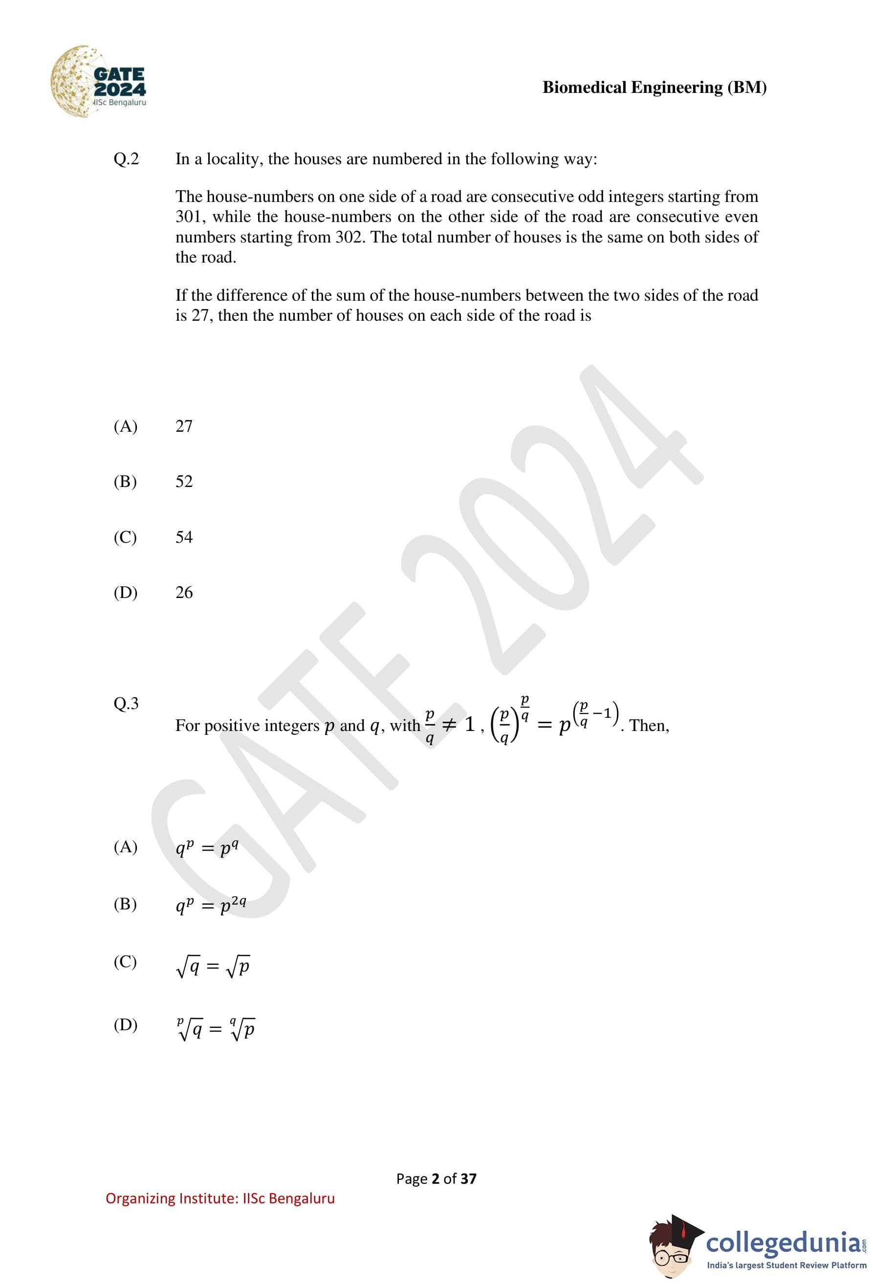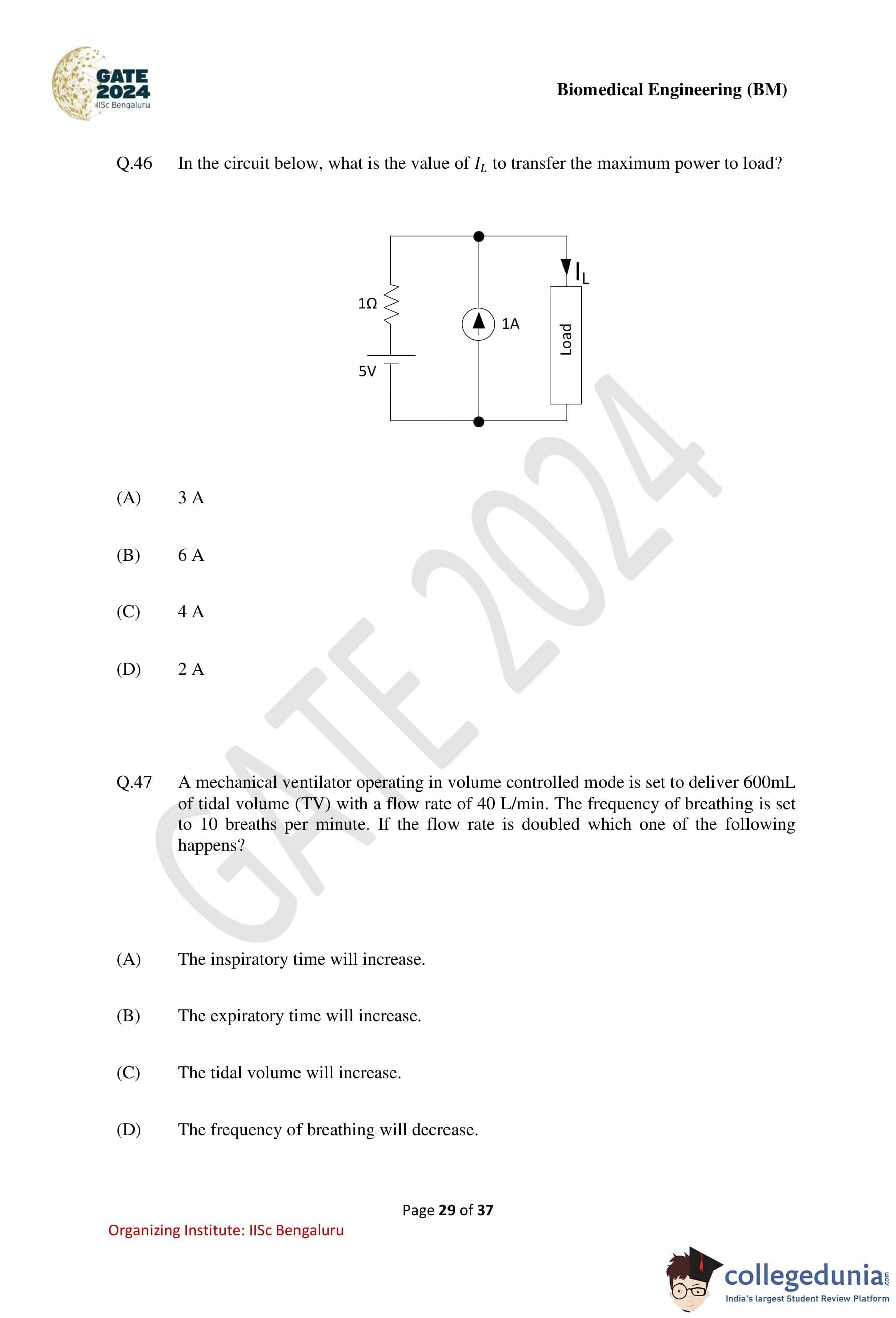 GATE 2024 Biomedical Engineering Question Paper PDF is available here. IISc Banglore conducted GATE 2024 Biomedical Engineering exam on February 4 in the Forenoon Session from 9:30 AM to 12:30 PM. Students have to answer 65 questions in GATE 2024 Biomedical Engineering Question Paper carrying a total weightage of 100 marks. 10 questions are from the General Aptitude section and 55 questions are from Engineering Mathematics and Core Discipline.