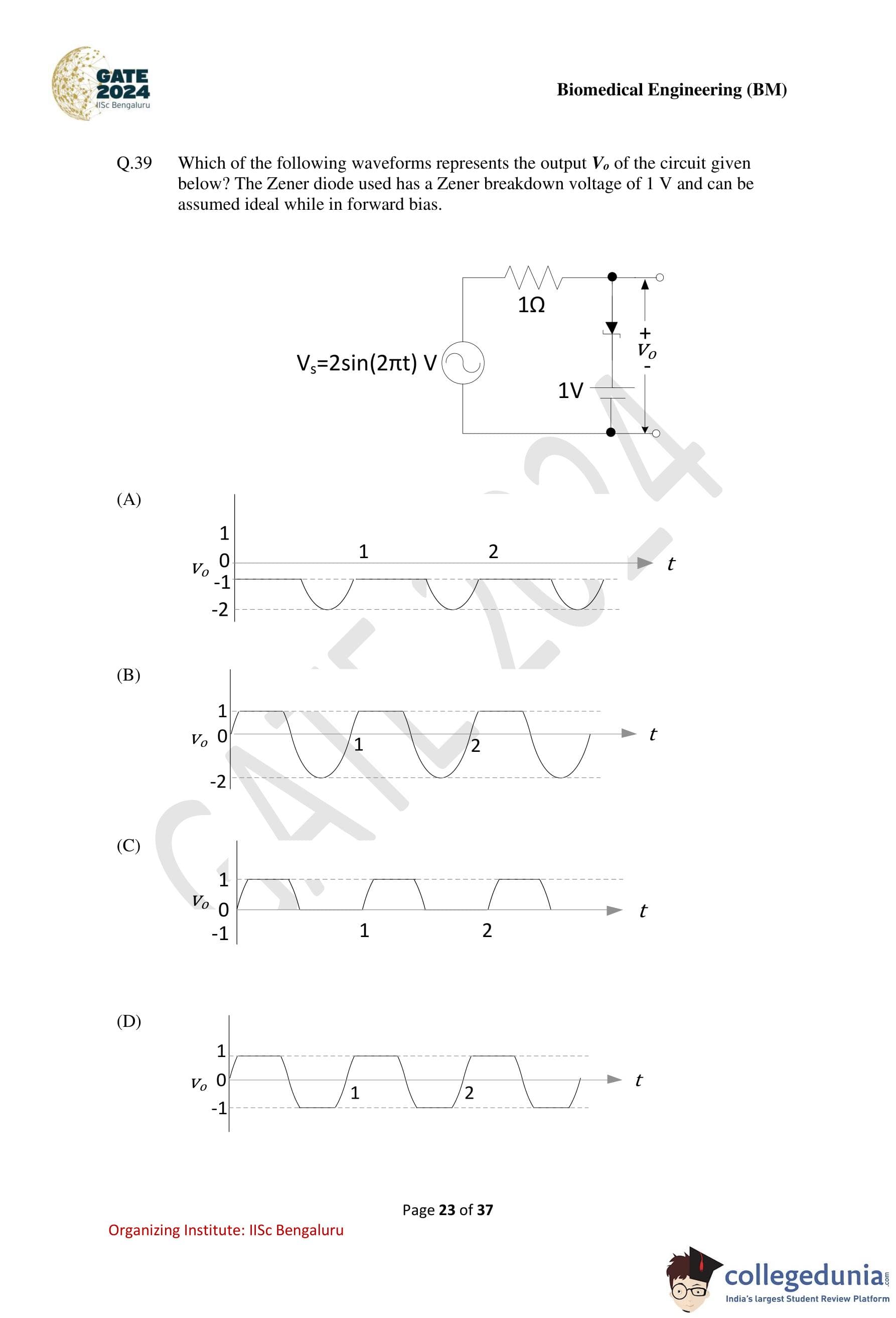 Which of the following waveforms represents the output \(V_o\) of the circuit given below? The Zener diode used has a Zener breakdown voltage of \(1\ V\) and can be assumed ideal while in forward bias.