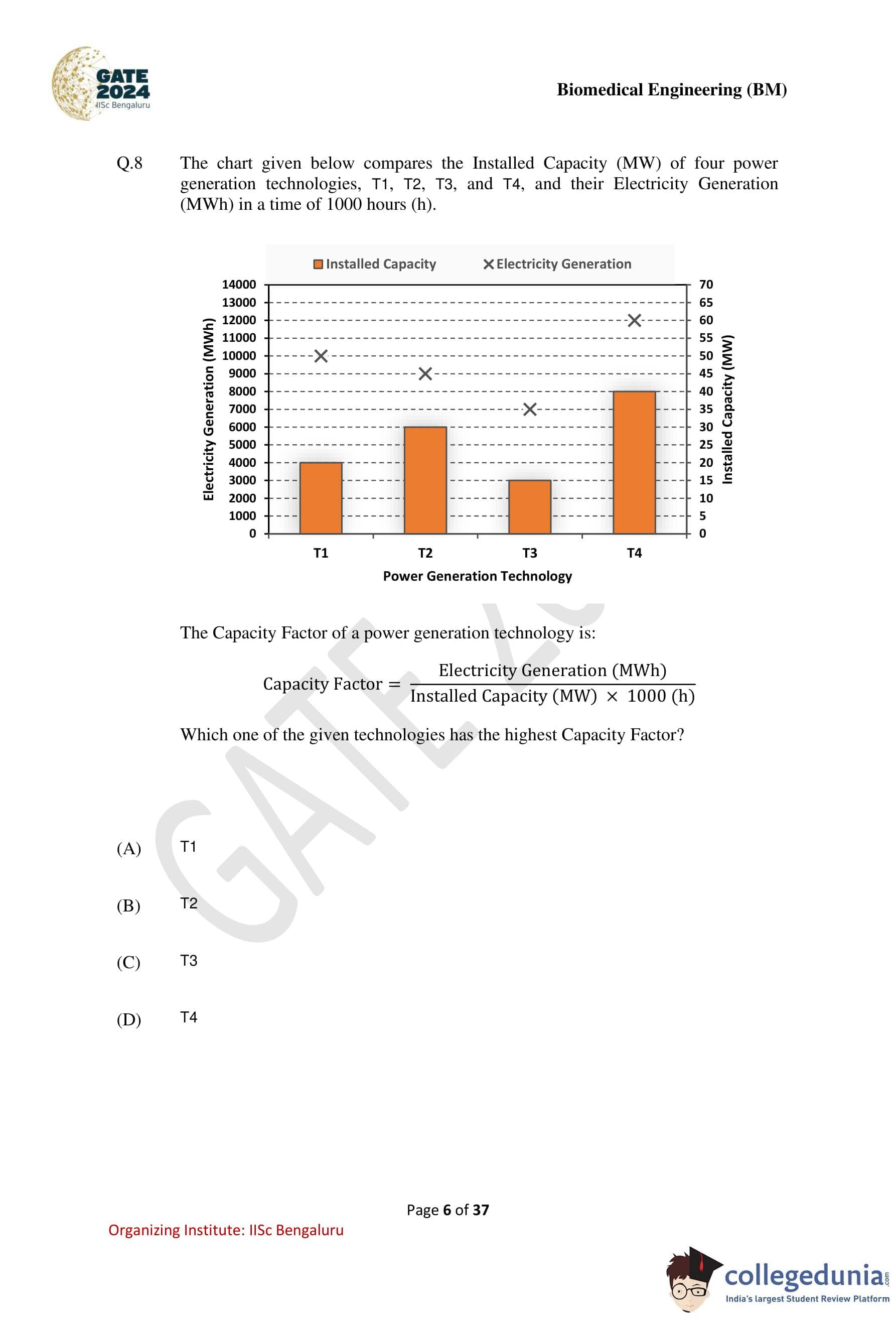 The chart given below compares the Installed Capacity (MW) of four power generation technologies, T1, T2, T3, and T4, and their Electricity Generation (MWh) in a time of 1000 hours.