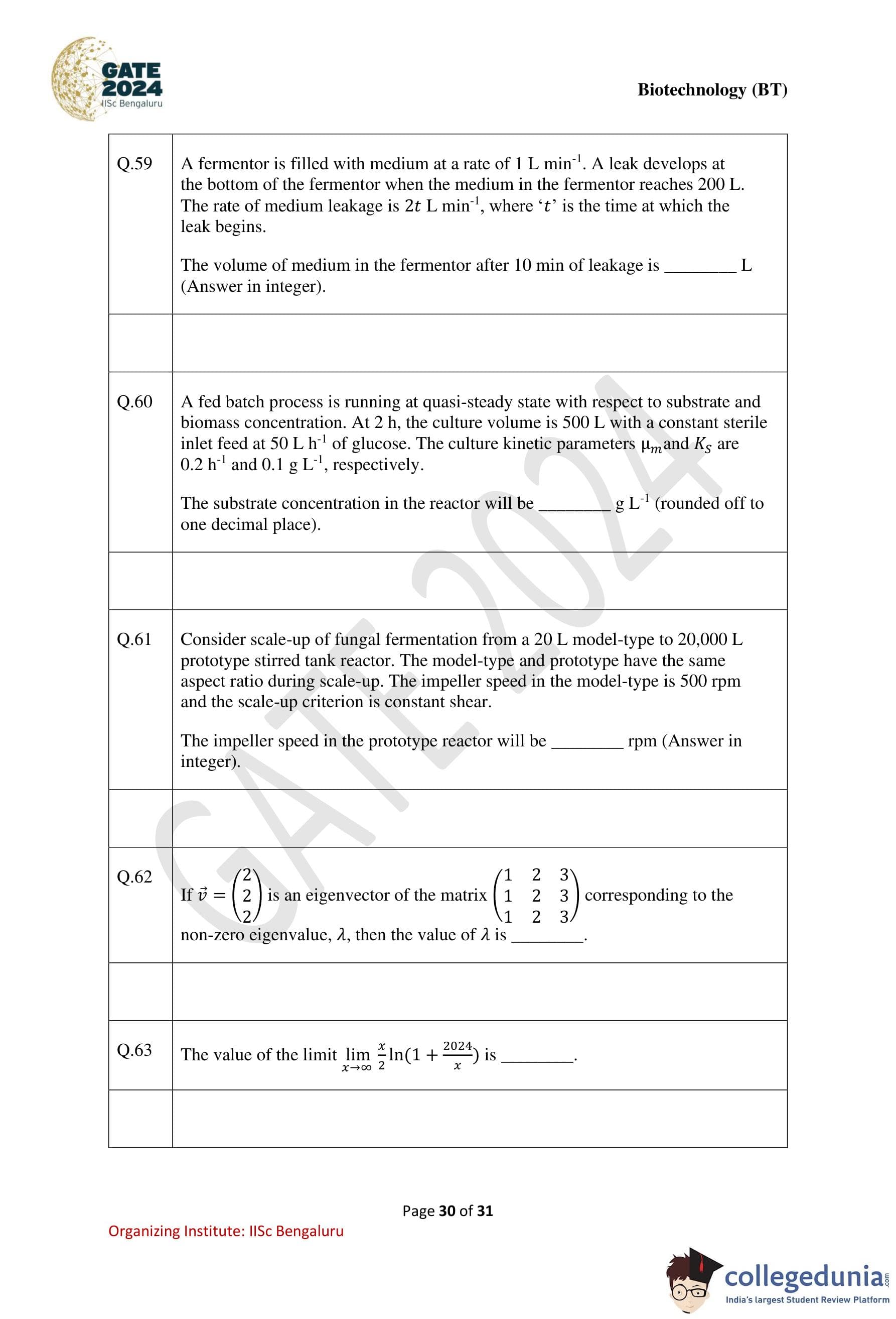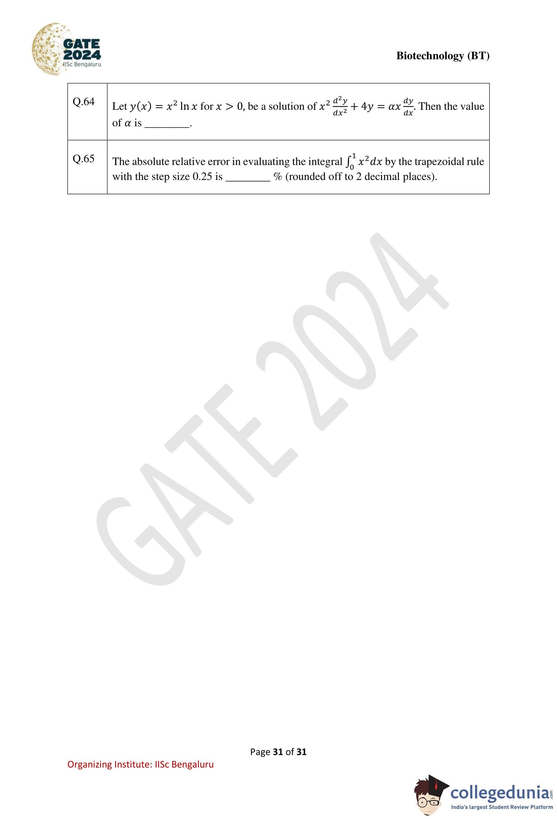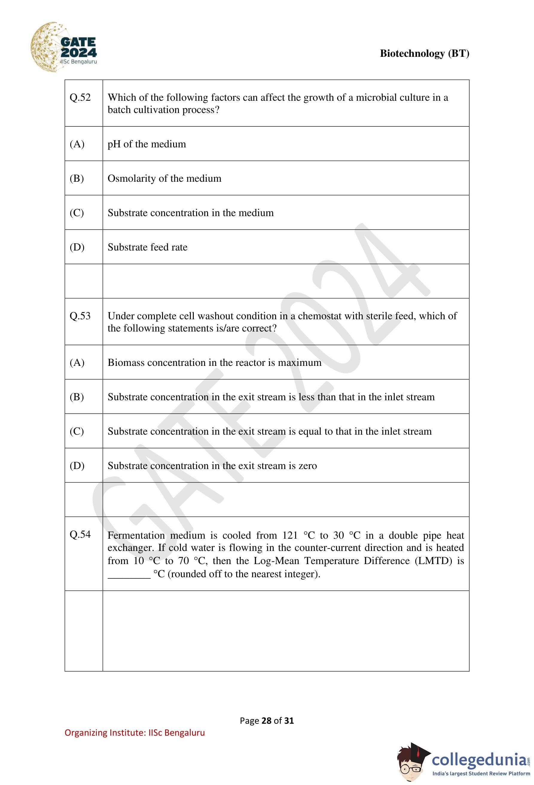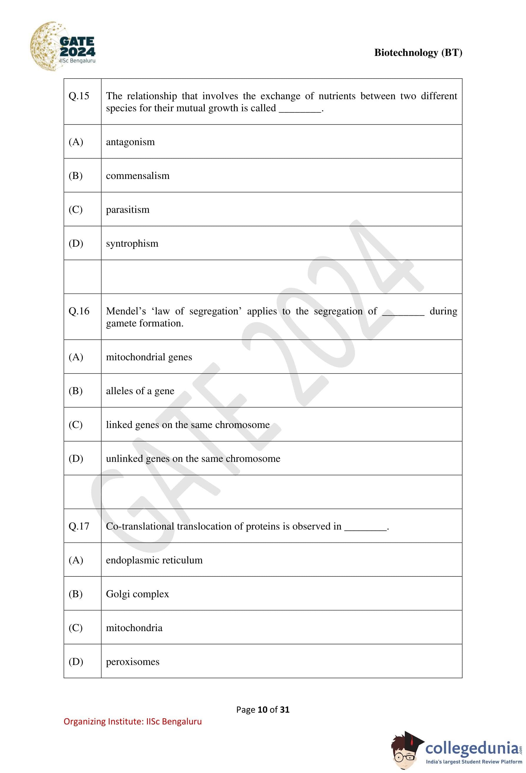 GATE 2024 Biotechnology Question Paper PDF is available here. IISc Banglore conducted GATE 2024 Biotechnology exam on February 10 in the Forenoon Session from 9:30 AM to 12:30 PM. Students have to answer 65 questions in GATE 2024 Biotechnology Question Paper carrying a total weightage of 100 marks. 10 questions are from the General Aptitude section and 55 questions are from Engineering Mathematics and Core Discipline.
