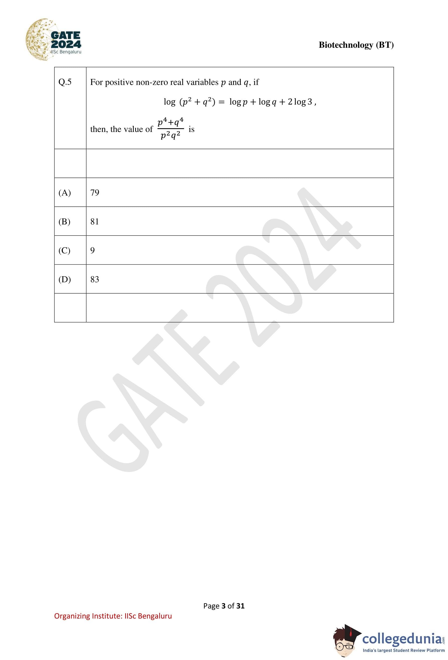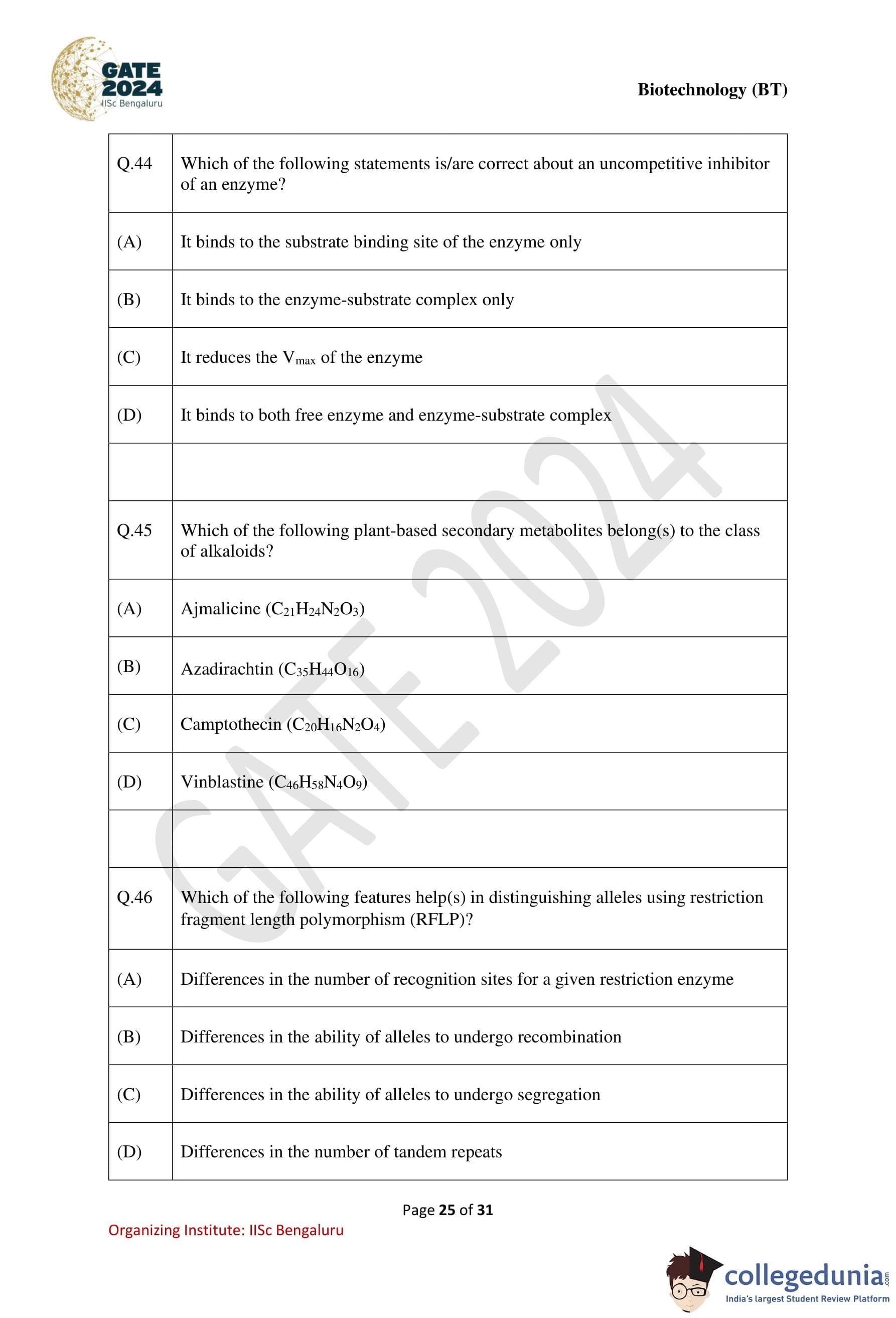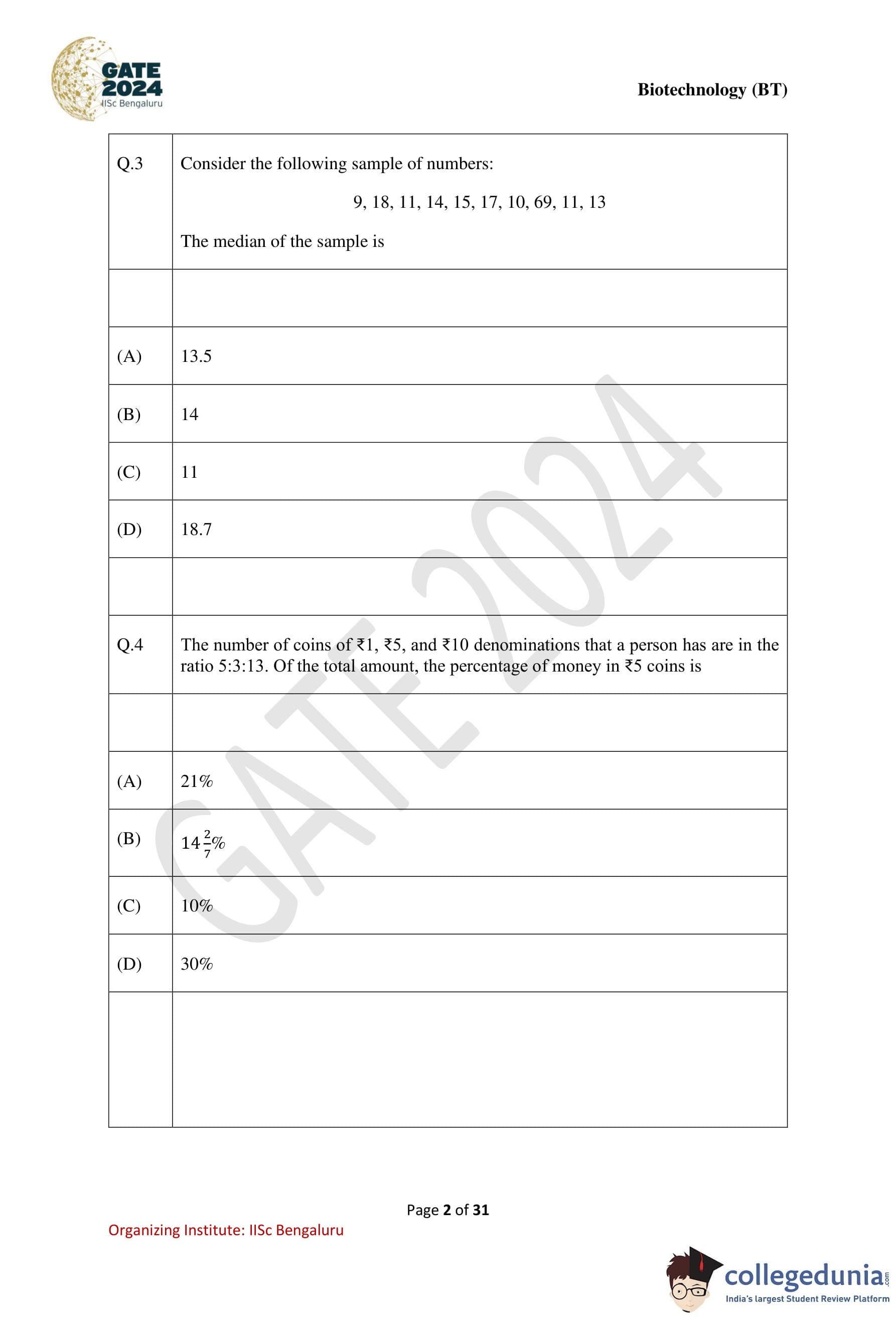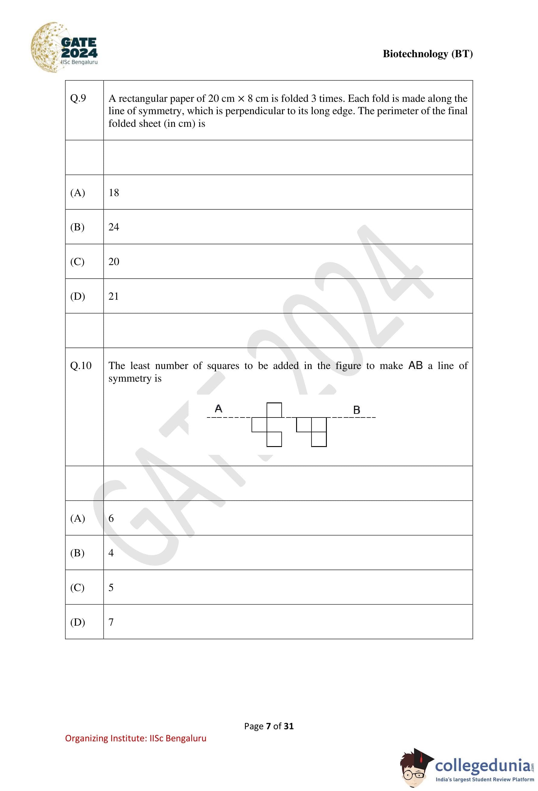 GATE 2024 Biotechnology Question Paper PDF is available here. IISc Banglore conducted GATE 2024 Biotechnology exam on February 10 in the Forenoon Session from 9:30 AM to 12:30 PM. Students have to answer 65 questions in GATE 2024 Biotechnology Question Paper carrying a total weightage of 100 marks. 10 questions are from the General Aptitude section and 55 questions are from Engineering Mathematics and Core Discipline.