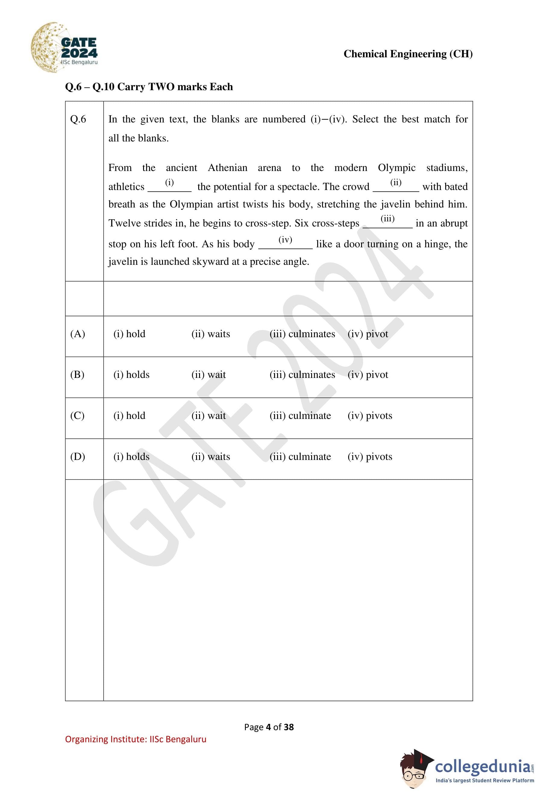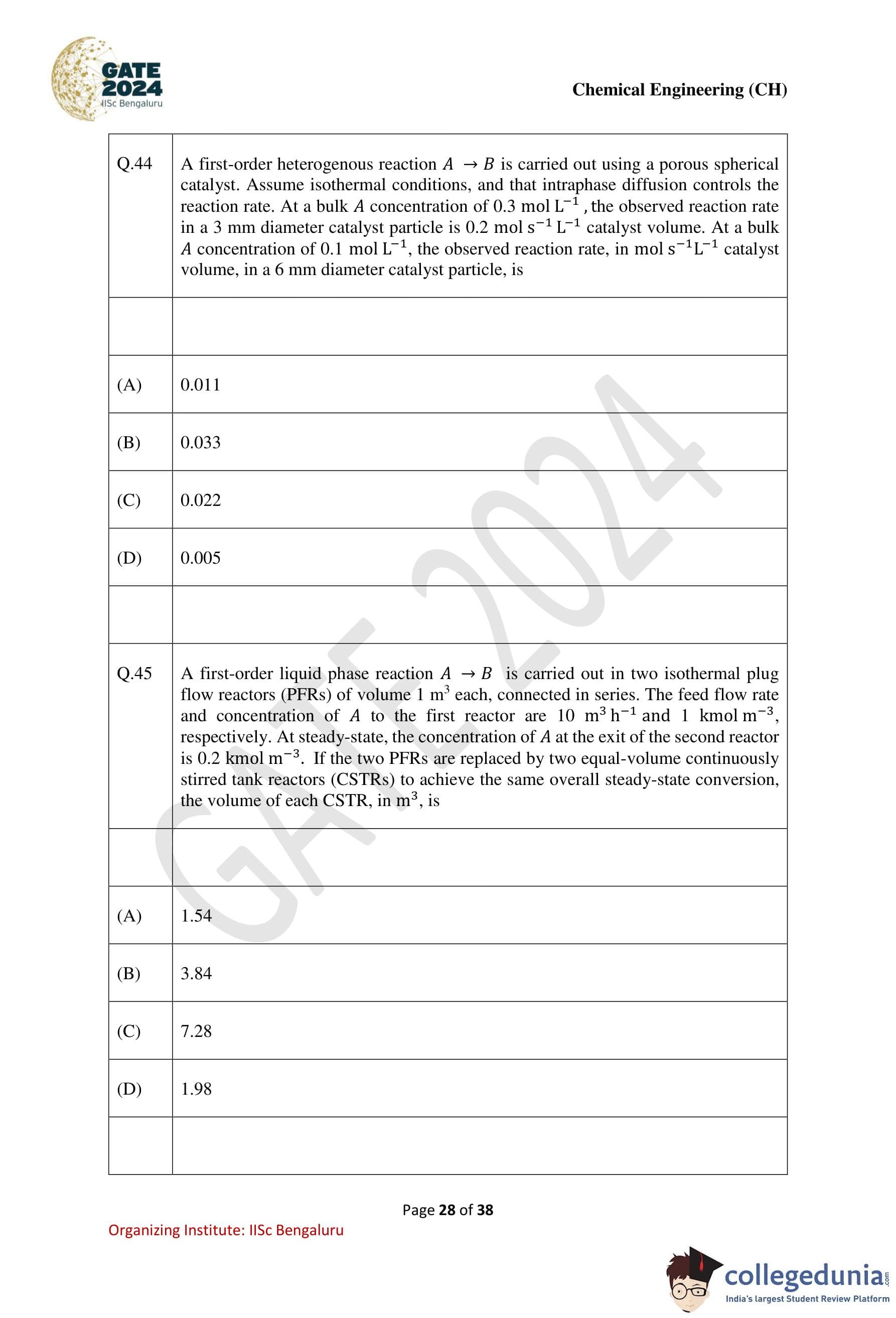 GATE 2024 Chemical Engineering Question Paper PDF is available here. IISc Banglore conducted GATE 2024 Chemical Engineering exam on February 4 in the Forenoon Session from 9:30 AM to 12:30 PM. Students have to answer 65 questions in GATE 2024 Chemical Engineering Question Paper carrying a total weightage of 100 marks. 10 questions are from the General Aptitude section and 55 questions are from Engineering Mathematics and Core Discipline.