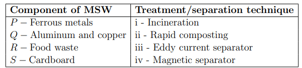 The following table gives various components of Municipal Solid Waste (MSW) and a list of treatment/separation techniques.