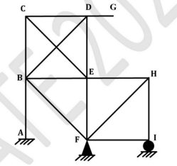 The plane frame shown in the figure has fixed support at joint A, hinge support at joint F, and roller support at joint I. In the figure, A to I indicate joints of the frame.