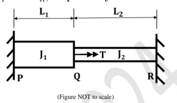 A homogeneous shaft PQR with fixed supports at both ends is subjected to a torsional moment \( T \) at point \( Q \), as shown in the figure. The polar moments of inertia of the portions \( PQ \) and \( QR \) of the shaft with circular cross-sections are \( J_1 \) and \( J_2 \), respectively. The torsional moment reactions at the supports \( P \) and \( R \) are \( T_P \) and \( T_R \), respectively.