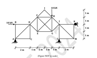 The plane truss shown in the figure has 13 joints and 22 members. The truss is made of a homogeneous, prismatic, linearly elastic material. All members have identical axial rigidity. Joints A to M indicate the joints of the truss. The truss has pin supports at joints A and L and roller support at joint K. The truss is subjected to a 10 kN vertically downward force at joint H and a 10 kN horizontal force in the rightward direction at joint B as shown.