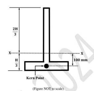 An inverted T-shaped concrete beam (B1) in the figure, with centroidal axis \(X - X\), is subjected to an effective prestressing force of 1000 kN acting at the bottom kern point of the beam cross-section. Also consider an identical concrete beam (B2) with the same grade of concrete but without any prestressing force.
