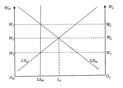 If the firm employs \(N_i\) units of workers, then the efficiency unit of labour employed by the firm is \(e_iN_i\). The production is based on only the efficiency unit of labour, and the production function is given by \[ F(e_iN_i)=\log_e(e_iN_i) \]