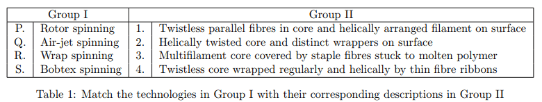 Group I lists yarn manufacturing technologies and Group II contains typical structural features of the yarns. Match the manufacturing technology with the structural features of the yarn.