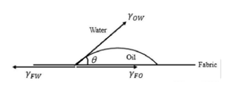 Consider the following diagram where an oil droplet is formed on a fabric immersed in water. At equilibrium, the balance of various interfacial forces acting on the droplet is given by the following equation: