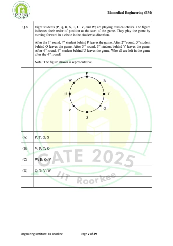 Eight students (P, Q, R, S, T, U, V, and W) are playing musical chairs. The figure indicates their order of position at the start of the game. They play the game by moving forward in a circle in the clockwise direction.