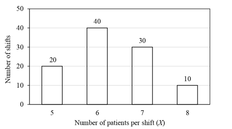 The number of shifts corresponding to different numbers of patients per shift is given in the bar graph. The amount Dr. Gita earns is \(1000(X - 0.2)\), where \(X\) is the number of patients per shift.