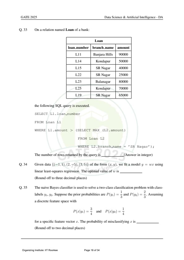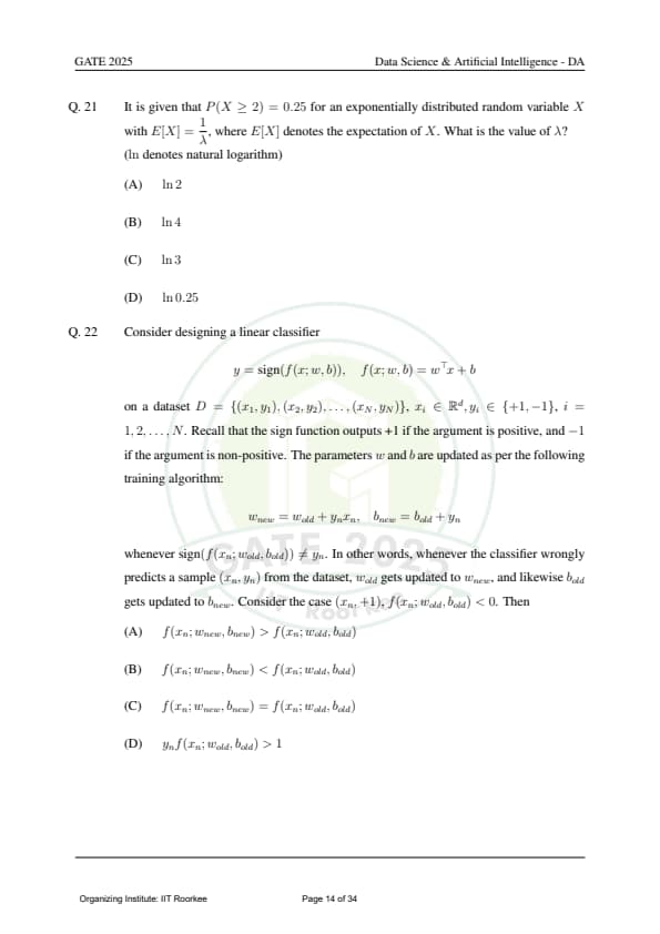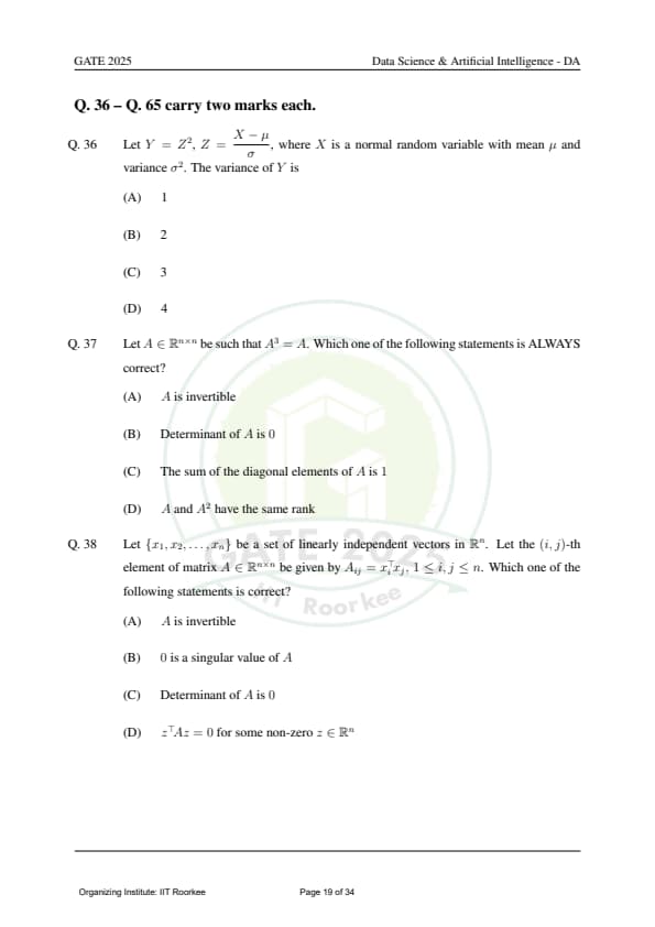 The GATE 2025 Data Science (DA) Question paper with Solution PDF is available to download here. GATE 2025 was conducted by IIT Roorkee As per the updated exam pattern, the exam consisted of 65 questions totaling 100 marks, with 10 questions from General Aptitude and 55 questions covering Data Science and AI topics.