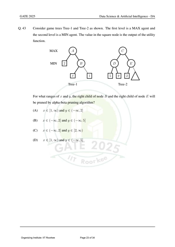 Consider game trees Tree-1 and Tree-2 as shown. The first level is a MAX agent and the second level is a MIN agent. The value in the square node is the output of the utility function.