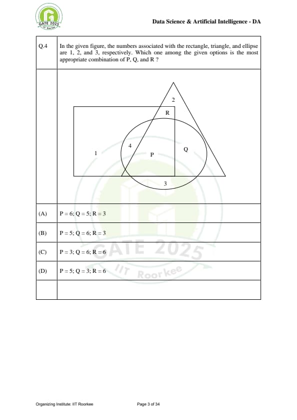 In the given figure, the numbers associated with the rectangle, triangle, and ellipse are 1, 2, and 3, respectively. Which one among the given options is the most appropriate combination of \( P \), \( Q \), and \( R \)?