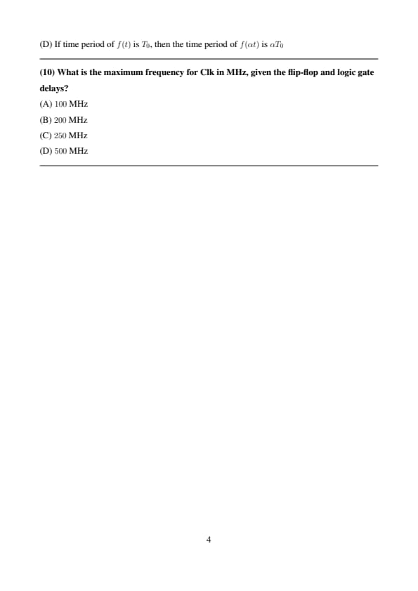 \[ \mathbf{200} MHz \] Quick Tip: For a synchronous sequential circuit, the maximum clock frequency is determined by the longest combinational delay path between flip-flops plus setup time constraints.