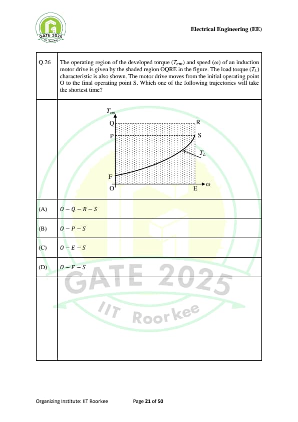The operating region of the developed torque \( T_{em} \) and speed \( \omega \) of an induction motor drive is given by the shaded region OQRE in the figure. The load torque \( T_L \) characteristic is also shown. The motor drive moves from the initial operating point O to the final operating point S. Which one of the following trajectories will take the shortest time?