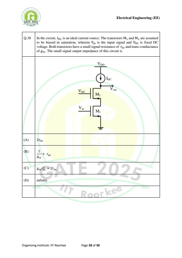 In the circuit, \( I_{DC} \) is an ideal current source. The transistors \( M_1 \) and \( M_2 \) are assumed to be biased in saturation, wherein \( V_{in} \) is the input signal and \( V_{DC} \) is fixed DC voltage. Both transistors have a small signal resistance of \( r_{ds} \) and transconductance of \( g_m \). The small signal output impedance of this circuit is: