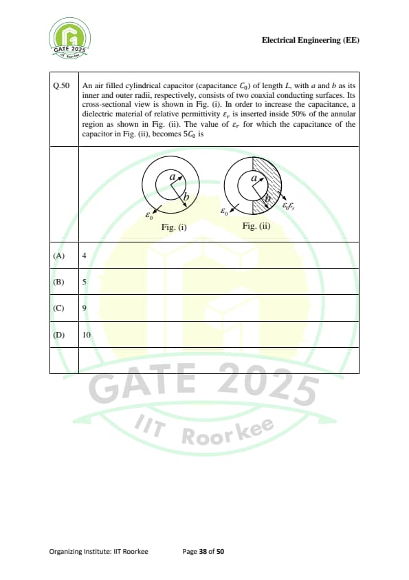 An air filled cylindrical capacitor (capacitance \( C_0 \)) of length \( L \), with \( a \) and \( b \) as its inner and outer radii, respectively, consists of two coaxial conducting surfaces. Its cross-sectional view is shown in Fig. (i). In order to increase the capacitance, a dielectric material of relative permittivity \( \varepsilon_r \) is inserted inside 50% of the annular region as shown in Fig. (ii). The value of \( \varepsilon_r \) for which the capacitance of the capacitor in Fig. (ii), becomes \( 5C_0 \) is