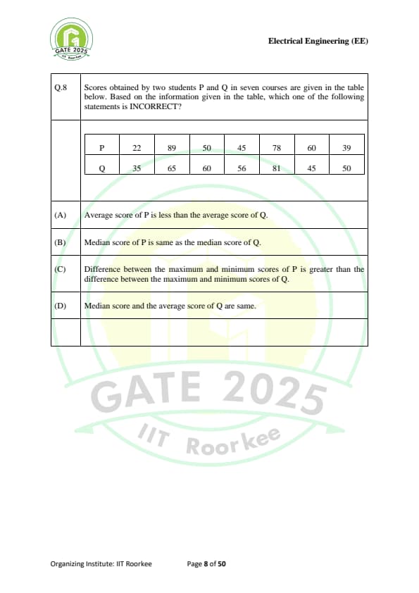 Scores obtained by two students P and Q in seven courses are given in the table below. Based on the information given in the table, which one of the following statements is \textbf{INCORRECT}?