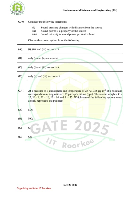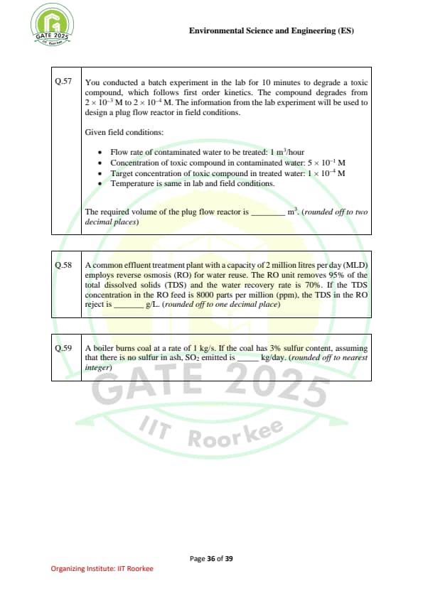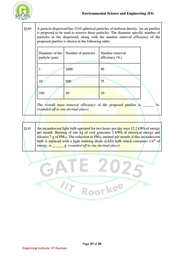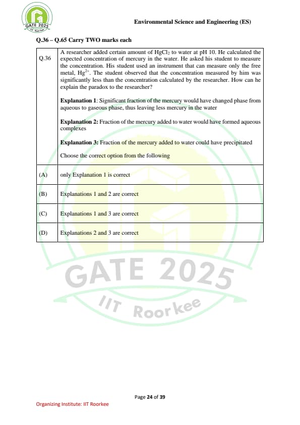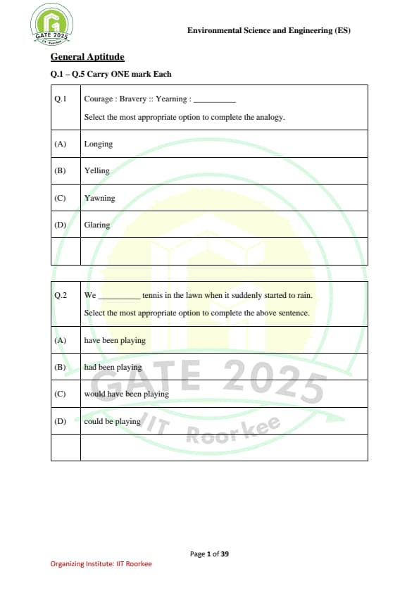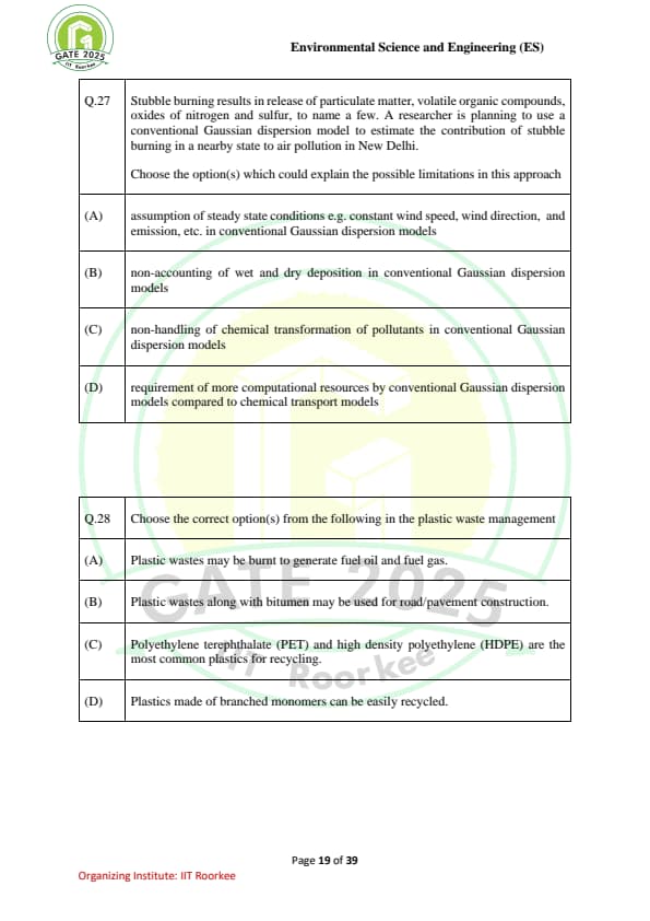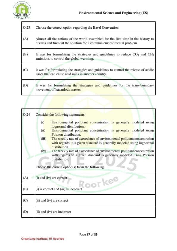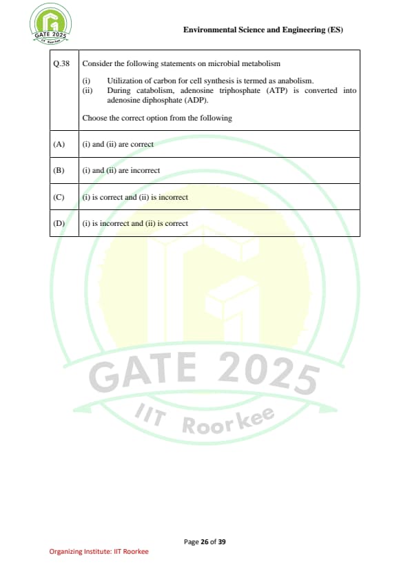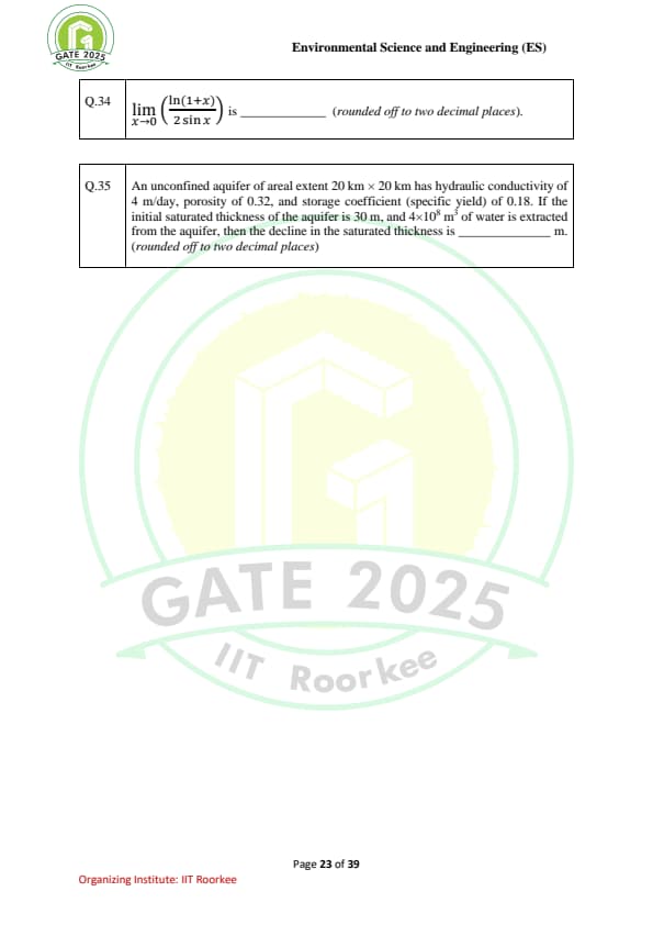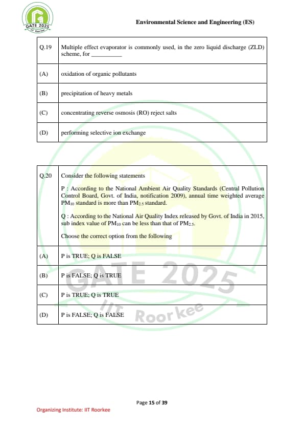 IIT Roorkee is conducting the GATE 2025 Environmental Science & Engineering (ES) exam, and the GATE 2025 ES Question Paper PDF is now available after the conclusion of the February 15 shift 1 from 9:30 AM to 12:30 PM. As per the updated exam pattern, the exam consists of 65 questions totaling 100 marks, with 10 questions from General Aptitude and 55 questions covering Engineering Mathematics and Environmental Science & Engineering topics.