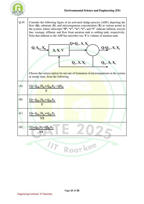 Consider the following figure of an activated sludge process (ASP), depicting the flow (Q), substrate (S), and microorganism concentration (X) at various points in the system, where subscripts “0”, “r”, “w”, “e”, and “i” indicate influent, recycle line, wastage, effluent, and flow from aeration tank to settling tank, respectively. Note that influent to the ASP has microbes too. V is volume of aeration tank.