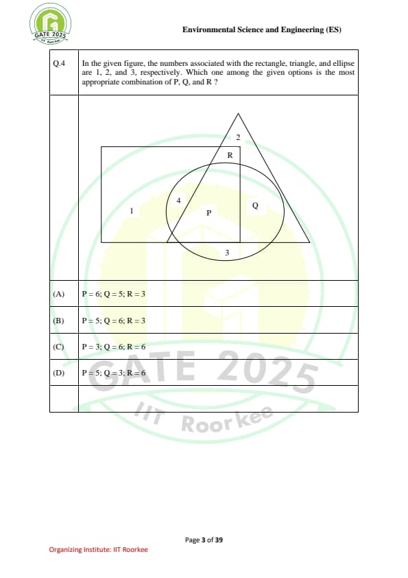In the given figure, the numbers associated with the rectangle, triangle, and ellipse are 1, 2, and 3, respectively. Which one among the given options is the most appropriate combination of \( P \), \( Q \), and \( R \)?