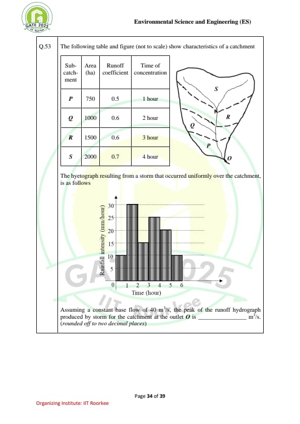 Assuming a constant base flow of 40 m\(^3\)/s, the peak of the runoff hydrograph produced by storm for the catchment at the outlet \(O\) is ________ m\(^3\)/s. (rounded off to two decimal places)
