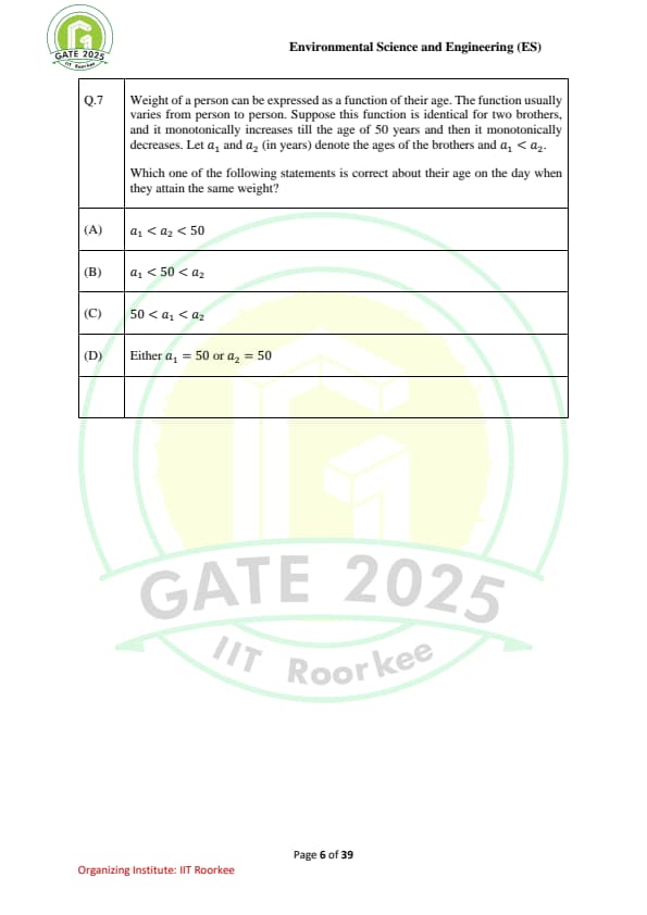 Weight of a person can be expressed as a function of their age. The function usually varies from person to person. Suppose this function is identical for two brothers, and it monotonically increases till the age of 50 years and then it monotonically decreases. Let \( a_1 \) and \( a_2 \) (in years) denote the ages of the brothers and \( a_1 < a_2 \).