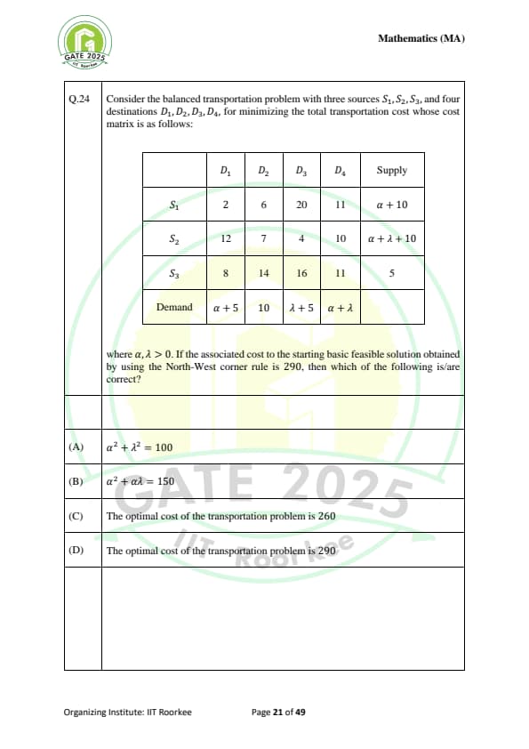 where \( \alpha, \lambda > 0 \). If the associated cost to the starting basic feasible solution obtained by using the North-West corner rule is 290, then which of the following is/are correct?