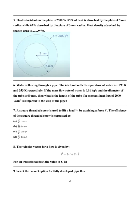 During a welding operation, thermal power of 2500 W is incident normally on a metallic surface. As shown in the figure below (figure is NOT to scale), the heated area is circular. Out of the incident power, 85% of the power is absorbed within a circle of radius 5 mm while 65% is absorbed within an inner concentric circle of radius 3 mm. The power density in the shaded area is _____ W mm\textsuperscript{-2} (rounded off to 2 decimal places).