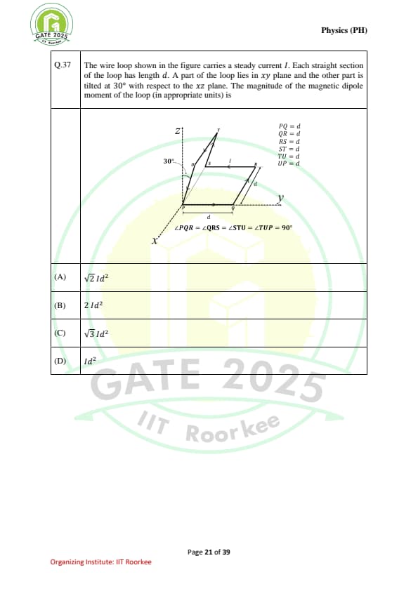 The wire loop shown in the figure carries a steady current \( I \). Each straight section of the loop has length \( d \). A part of the loop lies in the \( xy \)-plane and the other part is tilted at \( 30^\circ \) with respect to the \( xz \)-plane. The magnitude of the magnetic dipole moment of the loop (in appropriate units) is: