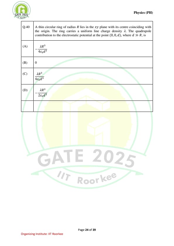 A thin circular ring of radius \( R \) lies in the \( xy \)-plane with its centre coinciding with the origin. The ring carries a uniform line charge density \( \lambda \). The quadrupole contribution to the electrostatic potential at the point \( (0, 0, d) \), where \( d \gg R \), is: