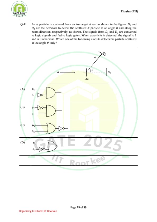 An \( \alpha \) particle is scattered from an Au target at rest as shown in the figure. \( D_1 \) and \( D_2 \) are the detectors to detect the scattered \( \alpha \) particle at an angle \( \theta \) and along the beam direction, respectively, as shown. The signals from \( D_1 \) and \( D_2 \) are converted to logic signals and fed to logic gates. When a particle is detected, the signal is 1 and is 0 otherwise. Which one of the following circuits detects the particle scattered at the angle \( \theta \) only?