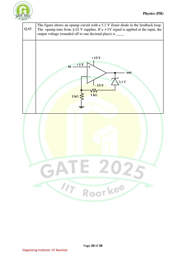 The figure shows an opamp circuit with a 5.1 V Zener diode in the feedback loop. The opamp runs from \( \pm 15 \, V \) supplies. If a \( +1 \, V \) signal is applied at the input, the output voltage (rounded off to one decimal place) is: