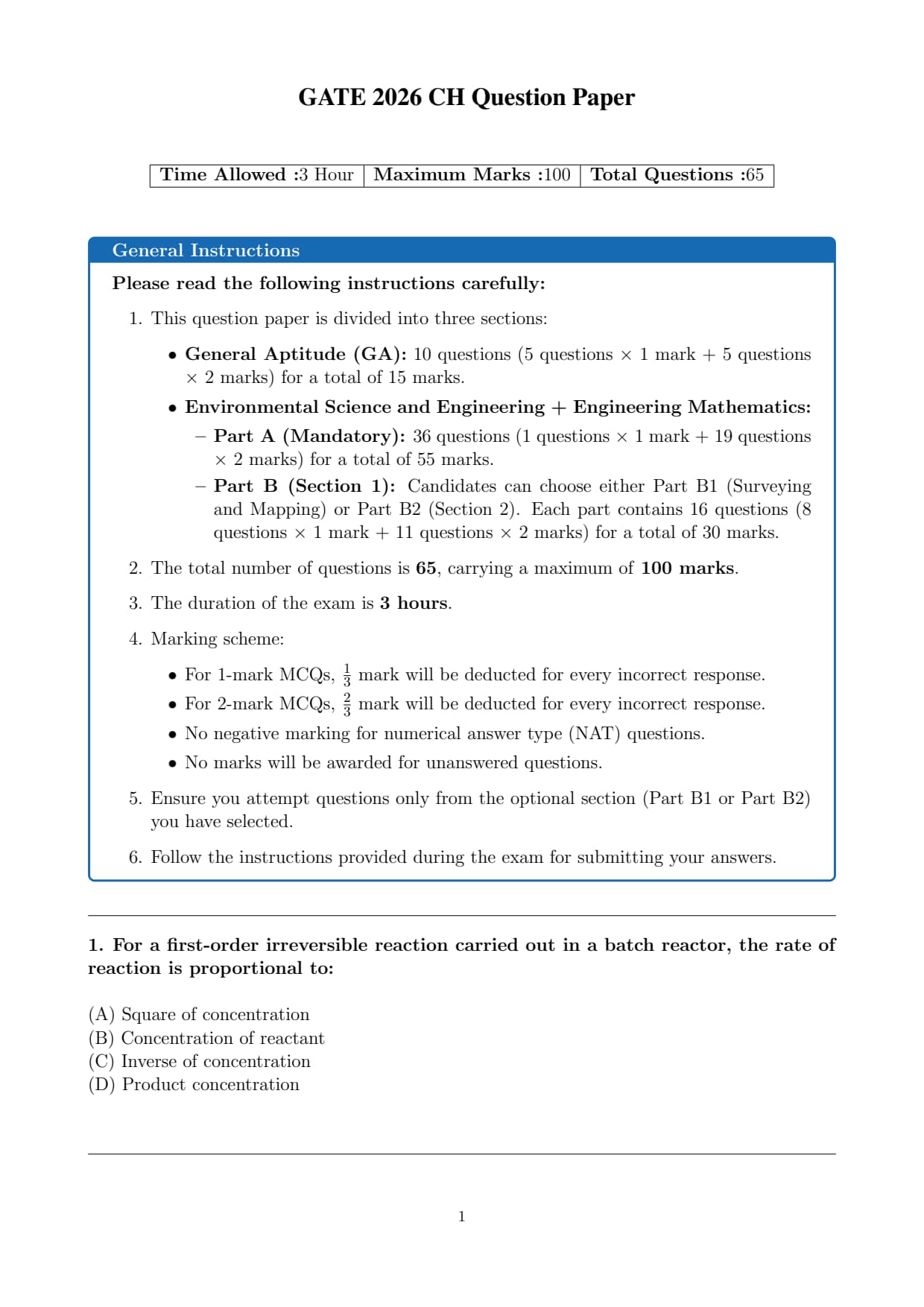 Based on the initial analysis, the GATE 2026 CH question paper was considered moderate to tough. To rank under 1000 in Instrumentation, you need to score 55-60+ marks out of 100.