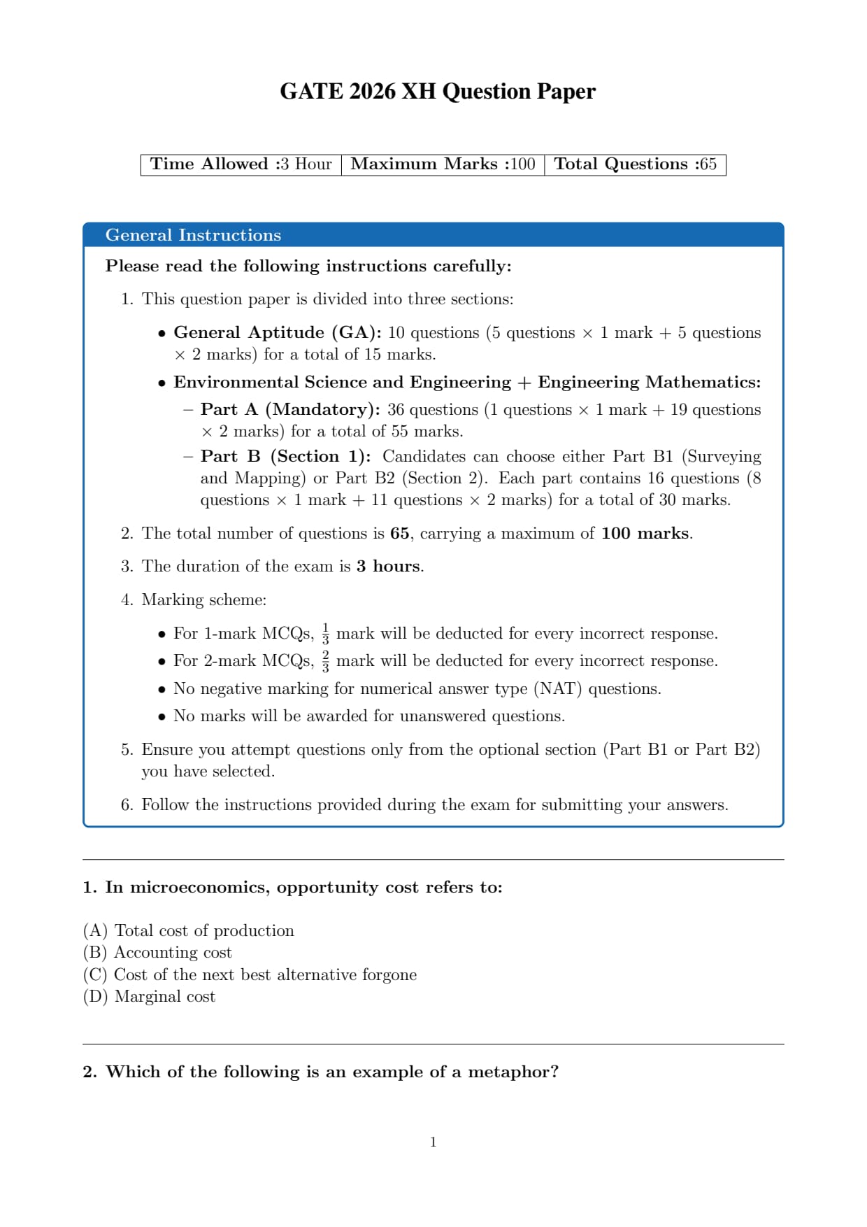 GATE 2026 XH Question Paper with Solution PDF (Memory – Based)