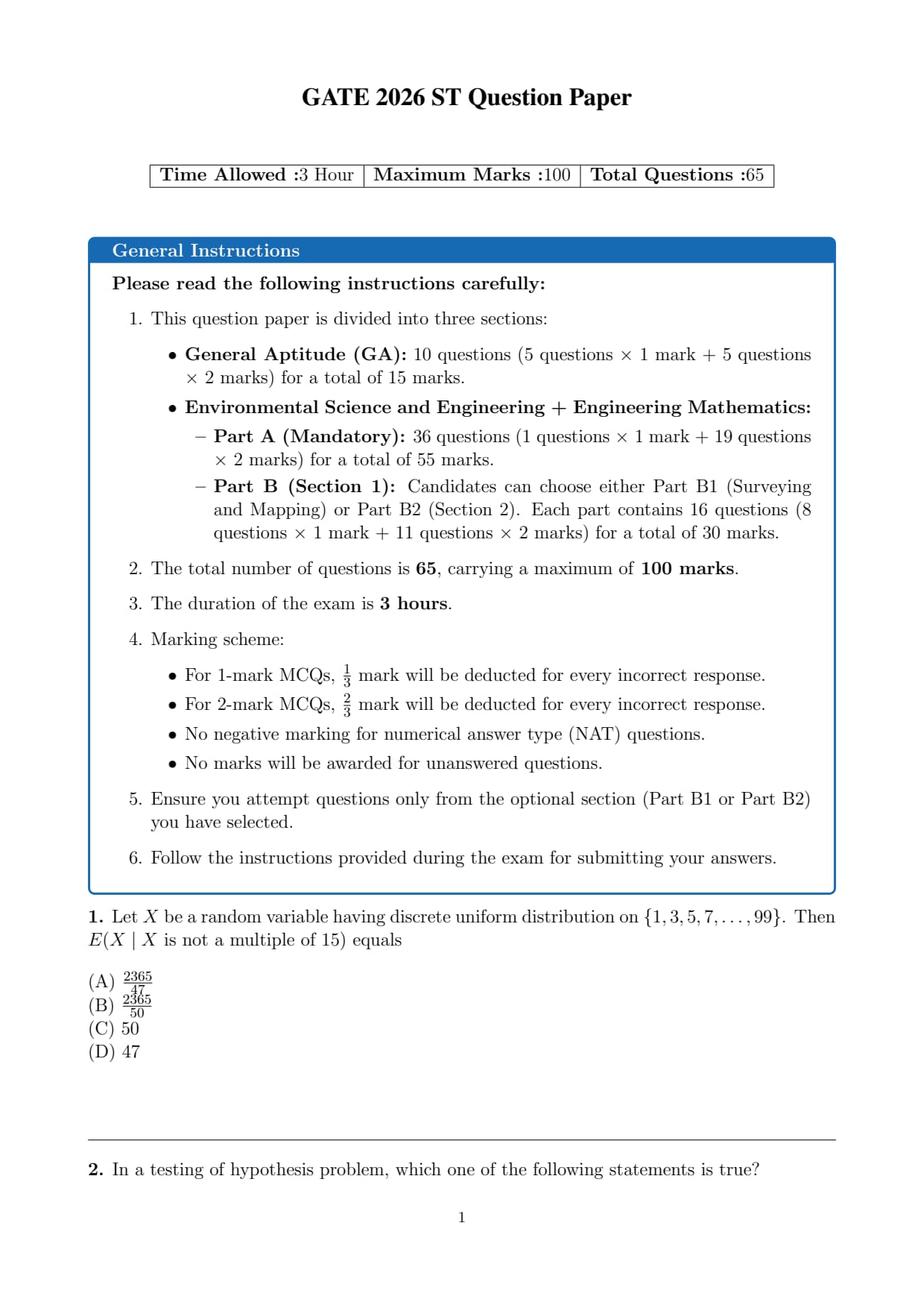 The question paper and solution PDF of the GATE 2026 ST (Statitstics) paper is available here for download. The exam for the GATE 2026 ST paper was conducted on 8th February in Session 1 (9:30 AM to 12:30 PM).