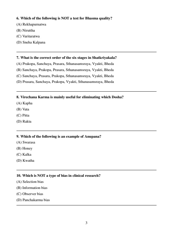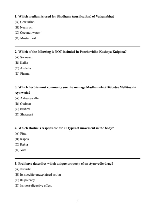 The exam evaluates candidates on their subject knowledge, conceptual clarity, and accuracy. It consists of MCQs from topics related to Kayachikitsa, Shalya Tantra, Dravyaguna, Rachana Sharir, and other core areas of Ayurveda.