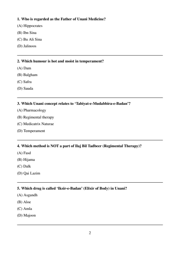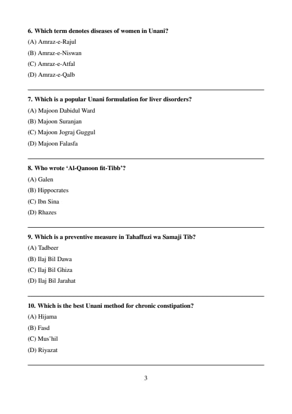 The exam evaluates candidates on their subject knowledge, conceptual clarity, and accuracy. It consists of MCQs from topics related to Moalijat, Ilmul Advia, Tahaffuzi wa Samaji Tib, Ilmul Qabalat wa Amraze Niswan, and other core areas of Unani Medicine.