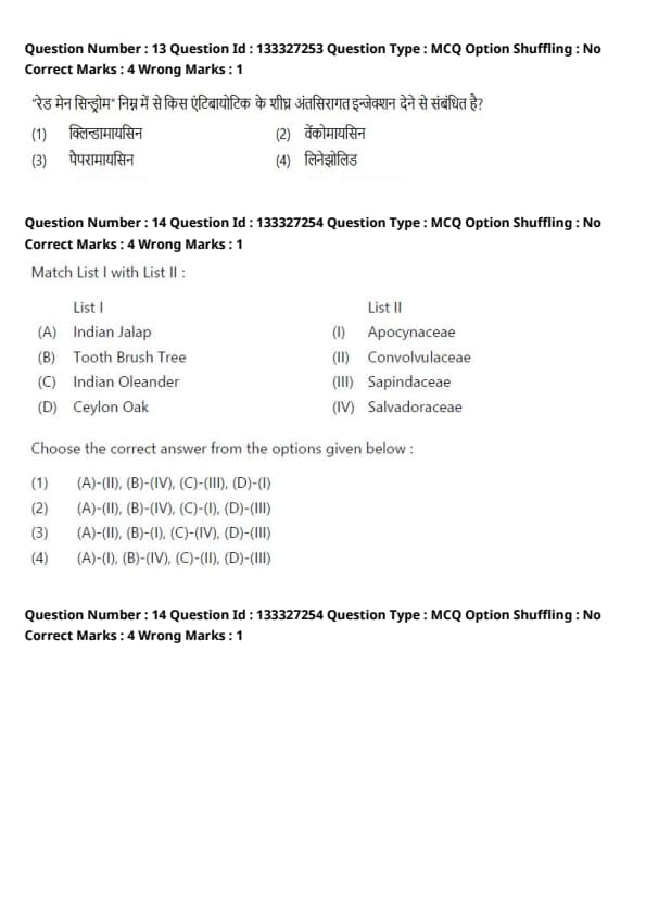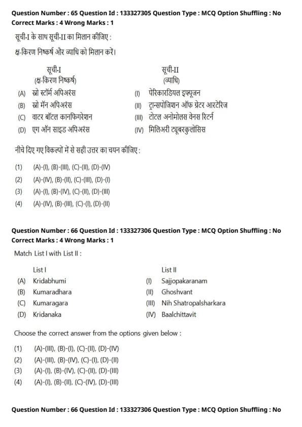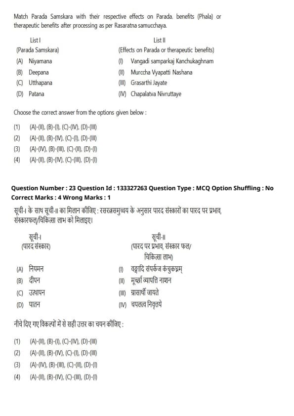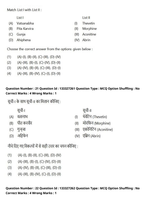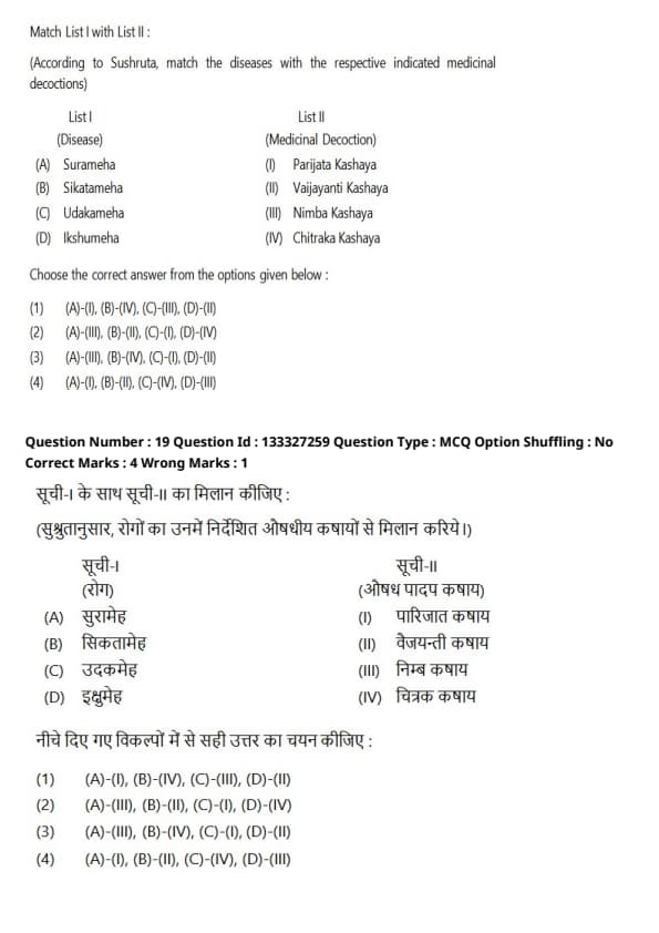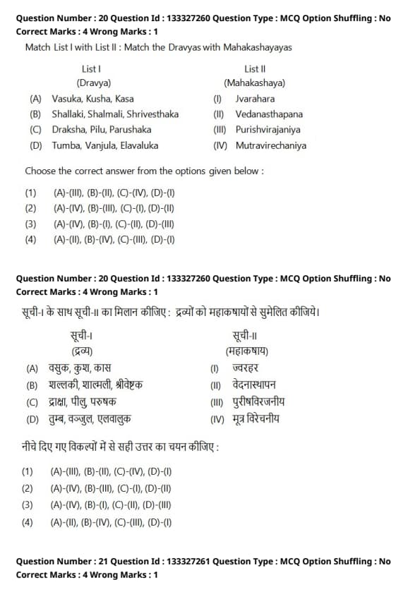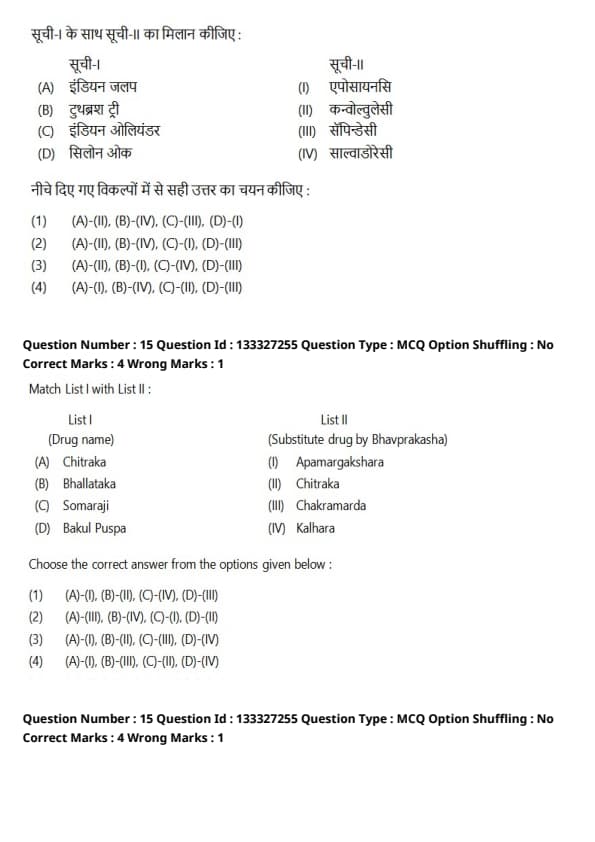 Thus, the correct matching is (A)-(I), (B)-(II), (C)-(III), (D)-(IV). Quick Tip: In Bhavprakasha, substitute drugs are often provided for common medicines based on similar therapeutic properties.