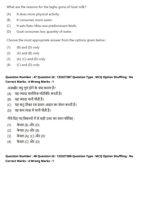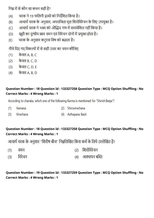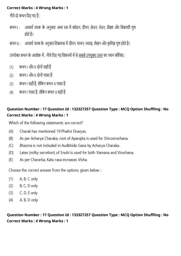 Thus, the correct option is (4): A, B, D only. Quick Tip: In Ayurveda, the properties and uses of herbs and substances like Snuhi latex are detailed for their specific therapeutic actions, such as Vamana and Virechana.