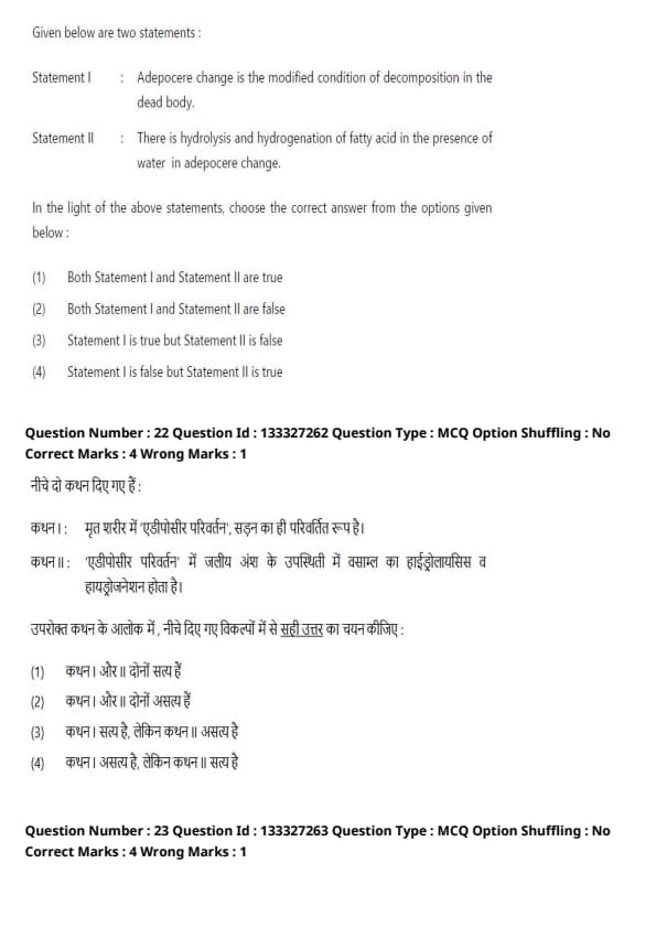Thus, the correct answer is (4), where Statement I is false but Statement II is true. Quick Tip: Adipocere formation is a complex process that involves hydrolysis and hydrogenation of fatty acids in the body.