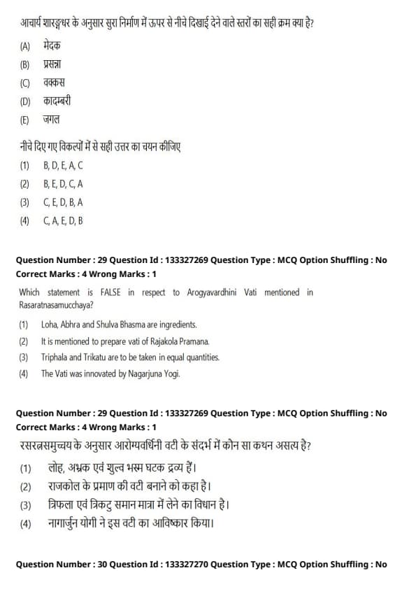 - Statement E: Katu rasa (pungent taste) does not increase Visha (poison) as per Ayurvedic texts, but rather has a stimulating effect. Hence, this statement is false.