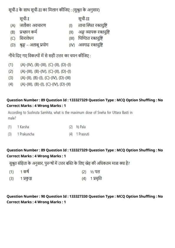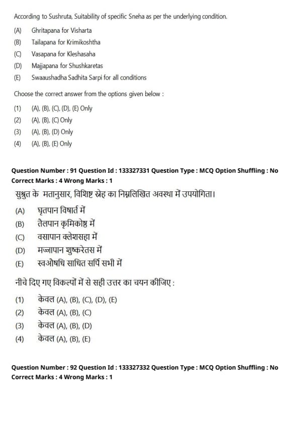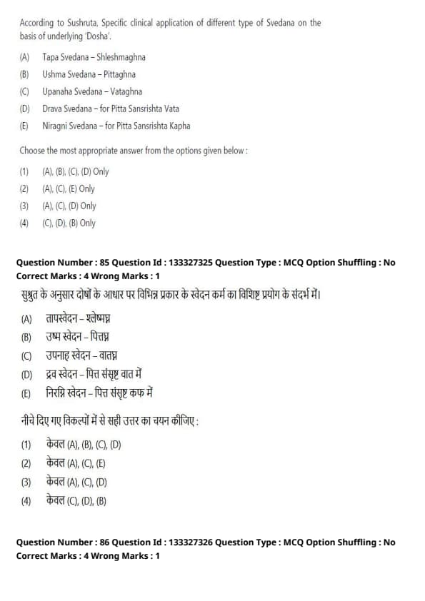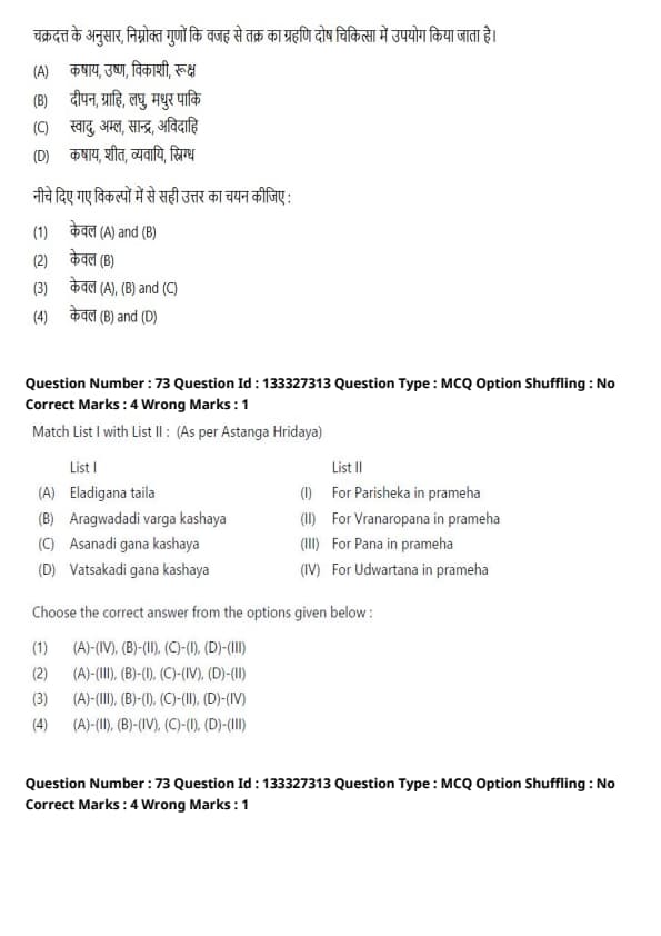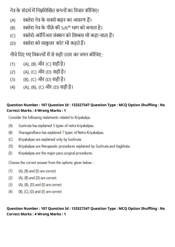 Therefore, the correct answer is (2) (A), (B) and (D) are correct. Quick Tip: Kriyakalpas are an important part of Ayurvedic therapeutic procedures and they focus on treatment techniques such as eye therapies.