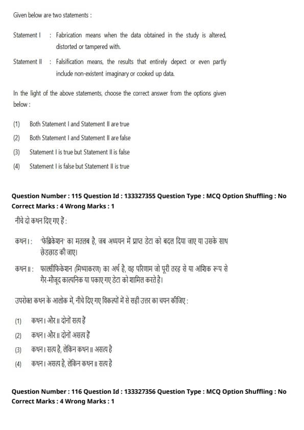 Fabrication refers to the process where researchers invent or make up data. This is different from the process described in Statement I, which states that fabrication involves altering or tampering with data. Fabrication specifically refers to creating false data, not merely distorting existing data. Statement II is also incorrect because falsification refers to manipulating or altering data, but it does not refer to making up non-existent data. Therefore, both statements are false. Quick Tip: Fabrication involves making up data that were not actually collected, whereas falsification involves manipulating or altering data to misrepresent results.