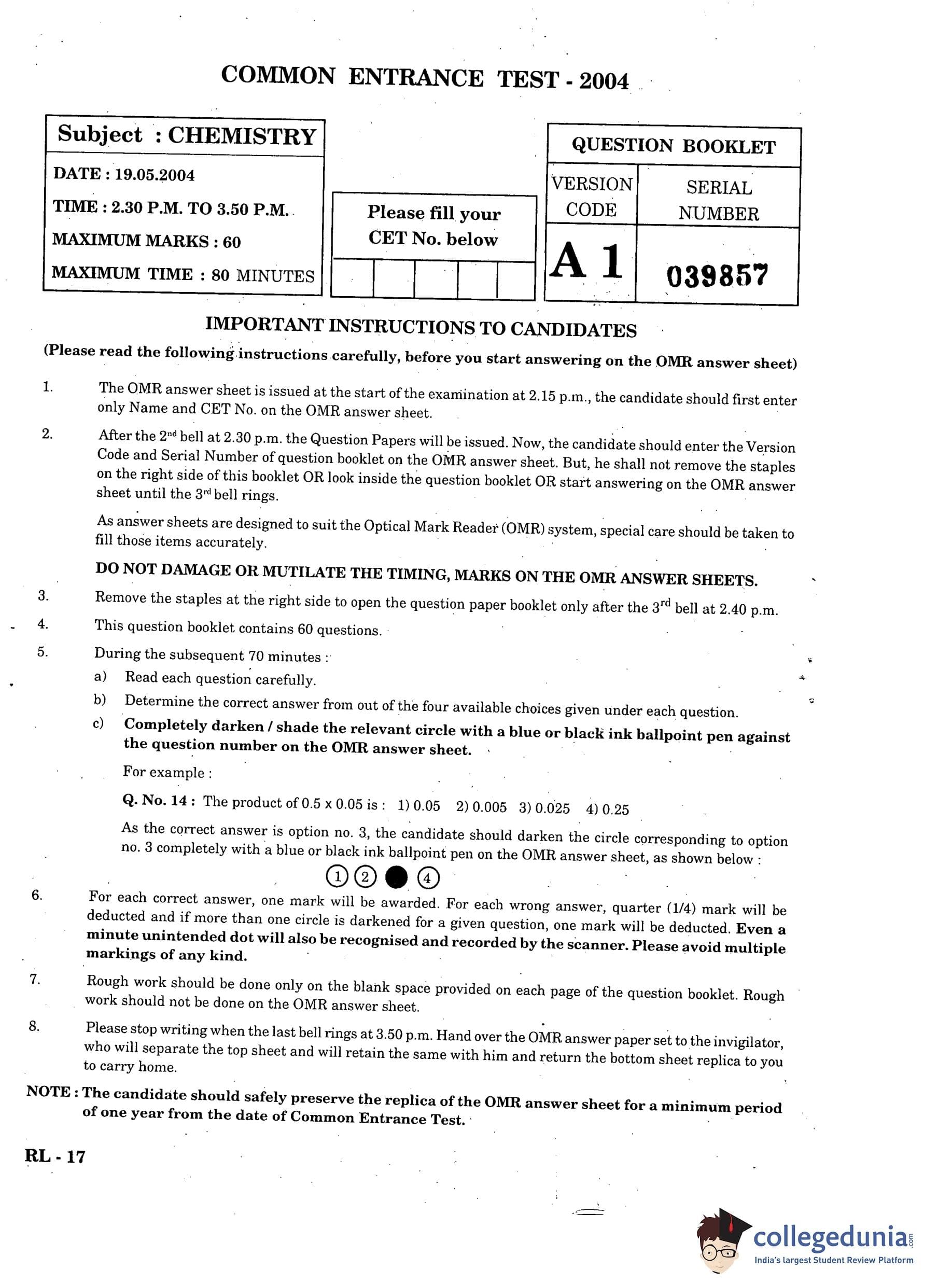 KCET 2004 Chemistry Question Paper with Answer Key pdf is available for download. The exam was conducted by Karnataka Examination Authority (KEA) on May 19, 2004 in the Afternoon Session 2:30 PM to 3:50 PM. The question paper comprised a total of 60 questions.